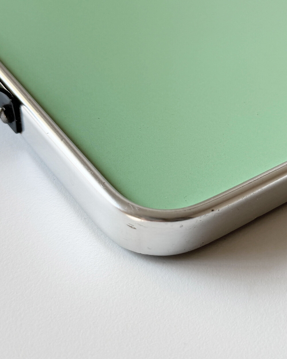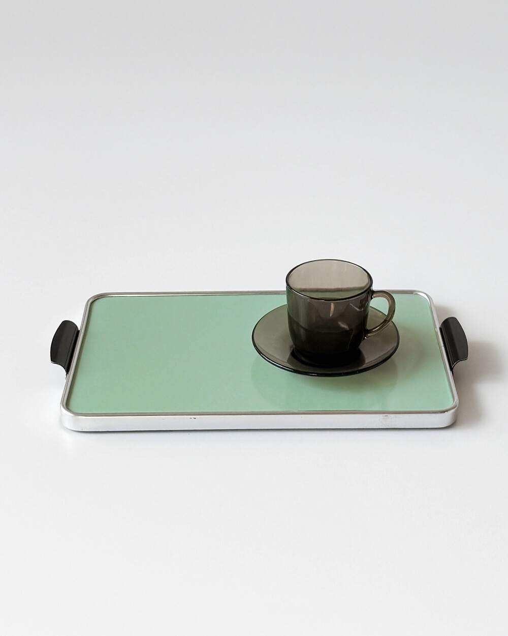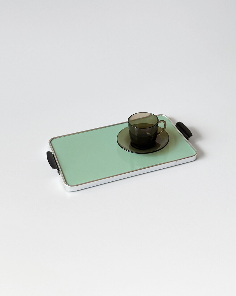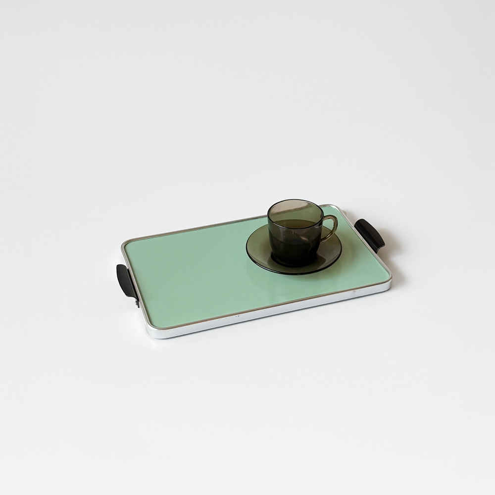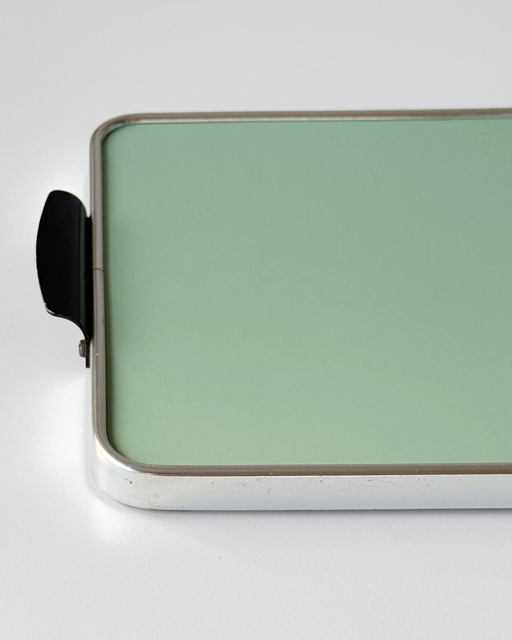 단정한 직사각 실루엣과 차분한 컬러감이 어우러진 장식용 트레이입니다. 민트색의 포마이카(Formica) 패널과 견고한 메탈 소재로 만들어졌으며, 양쪽에 블랙 핸들이 포인트로 더해졌습니다. 2-3조의 찻잔이나 6개의 글라스를 서빙할 수 있는 넉넉한 사이즈로 1960년대 서독일(DDR)의 가구회사에서 제작 되었습니다.