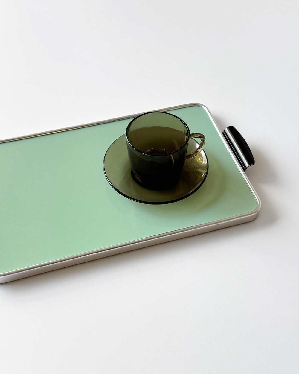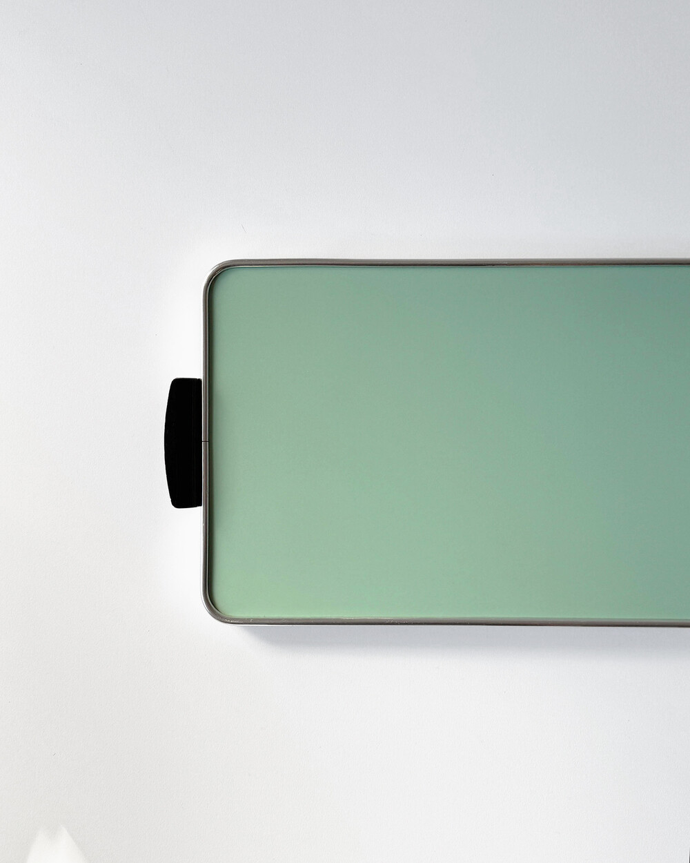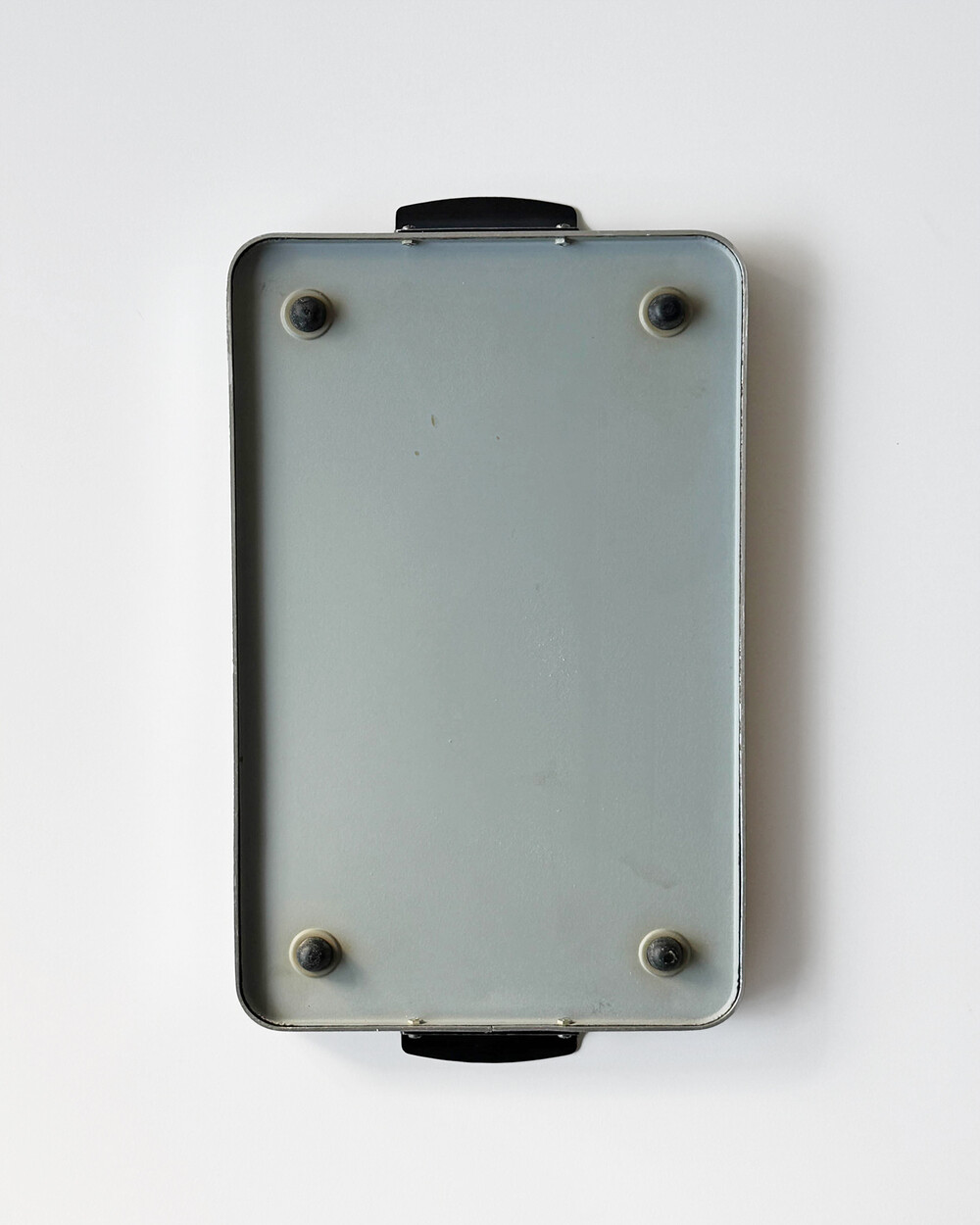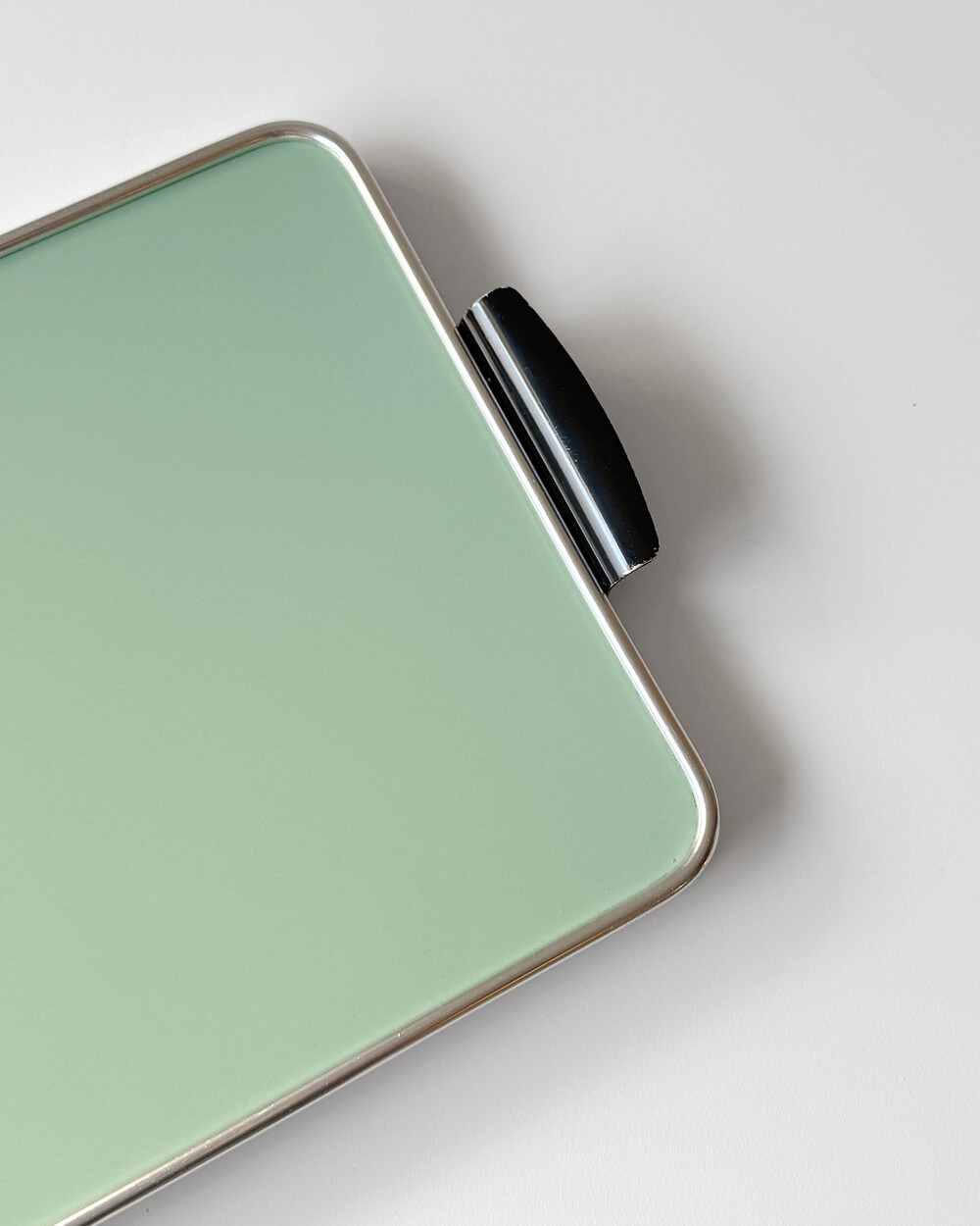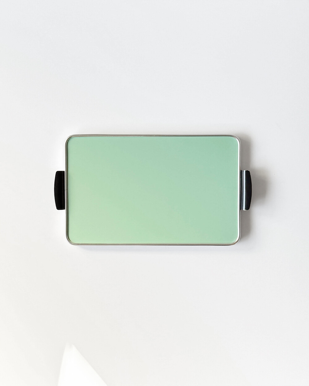 단정한 직사각 실루엣과 차분한 컬러감이 어우러진 장식용 트레이입니다. 민트색의 포마이카(Formica) 패널과 견고한 메탈 소재로 만들어졌으며, 양쪽에 블랙 핸들이 포인트로 더해졌습니다. 2-3조의 찻잔이나 6개의 글라스를 서빙할 수 있는 넉넉한 사이즈로 1960년대 서독일(DDR)의 가구회사에서 제작 되었습니다.