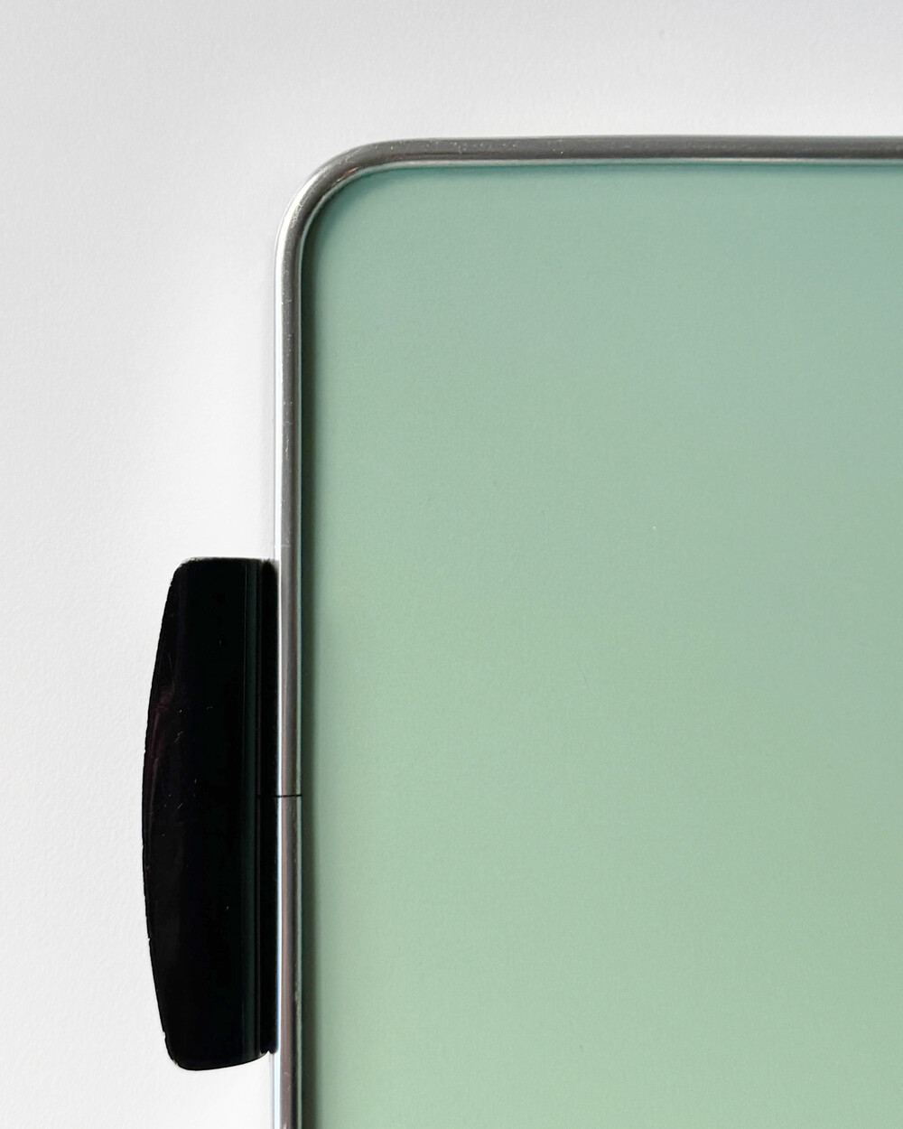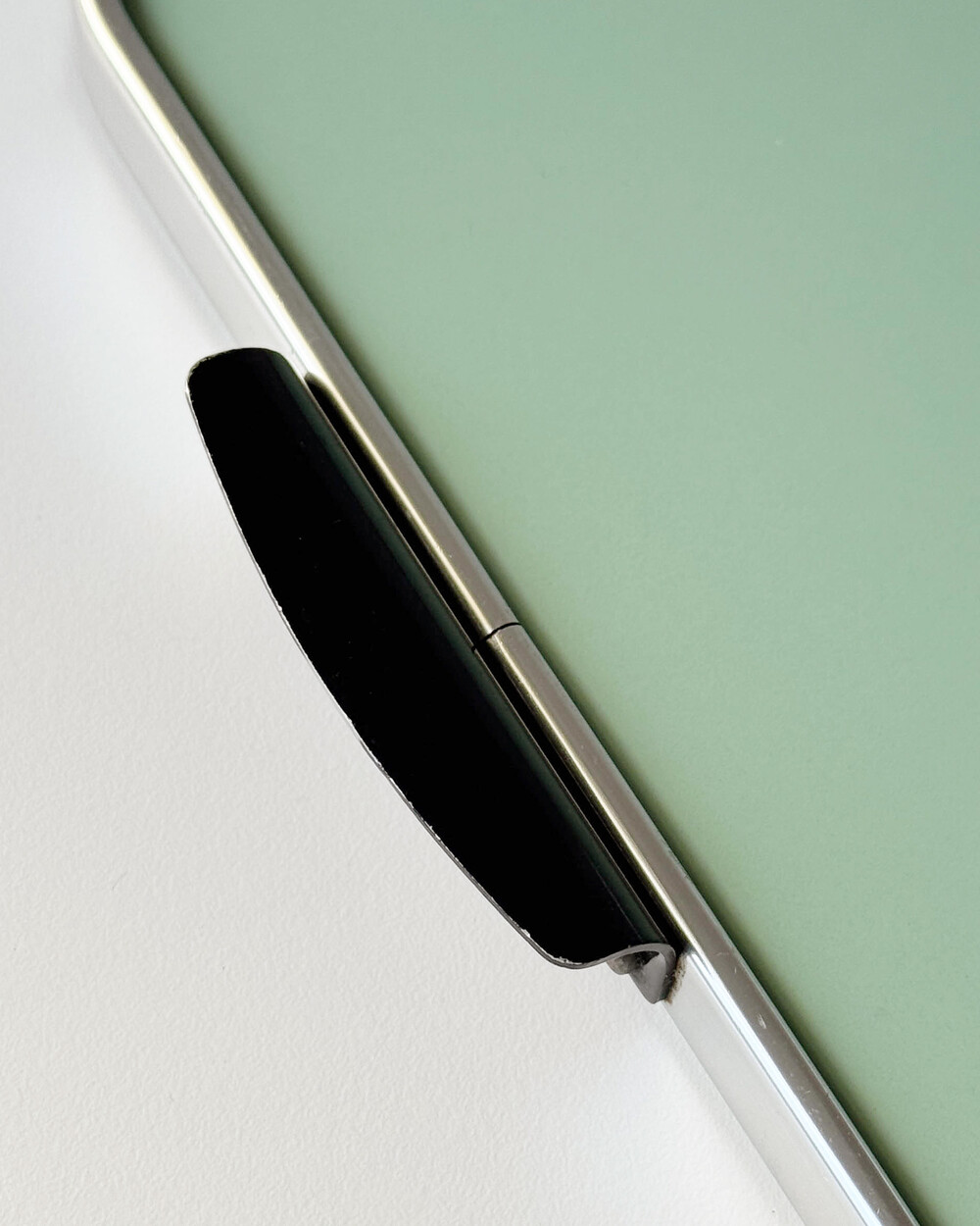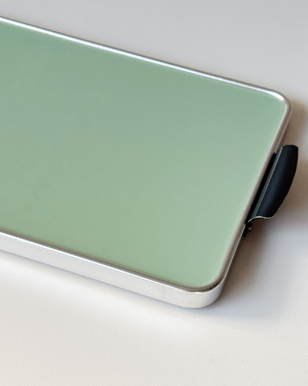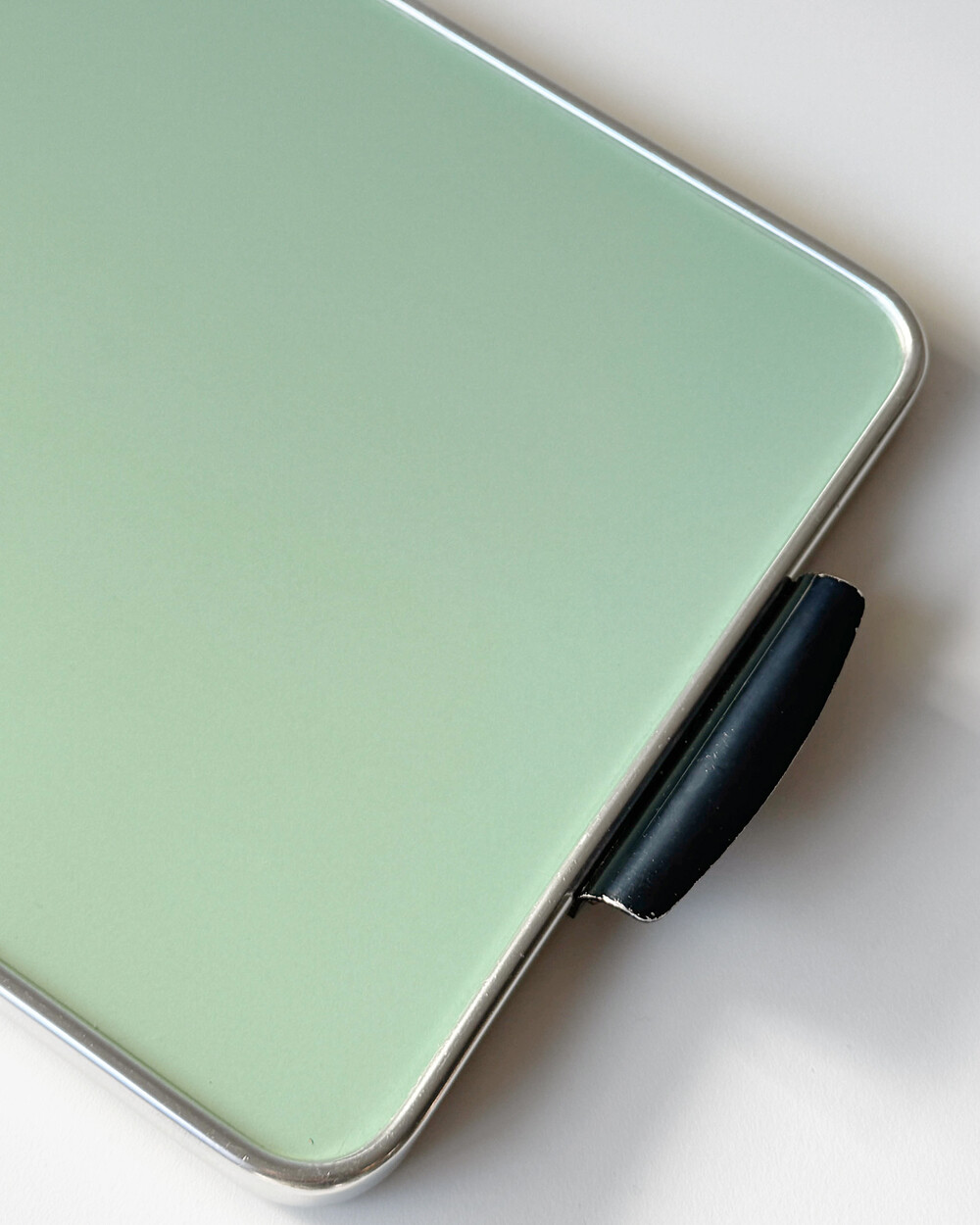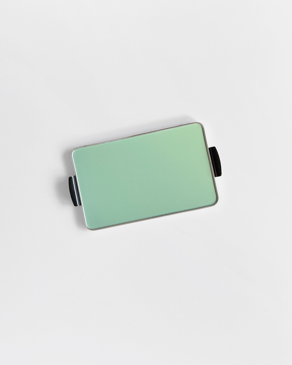 단정한 직사각 실루엣과 차분한 컬러감이 어우러진 장식용 트레이입니다. 민트색의 포마이카(Formica) 패널과 견고한 메탈 소재로 만들어졌으며, 양쪽에 블랙 핸들이 포인트로 더해졌습니다. 2-3조의 찻잔이나 6개의 글라스를 서빙할 수 있는 넉넉한 사이즈로 1960년대 서독일(DDR)의 가구회사에서 제작 되었습니다.