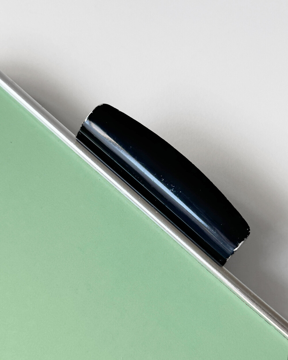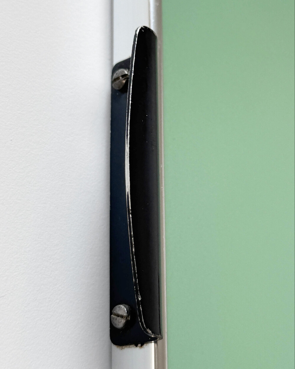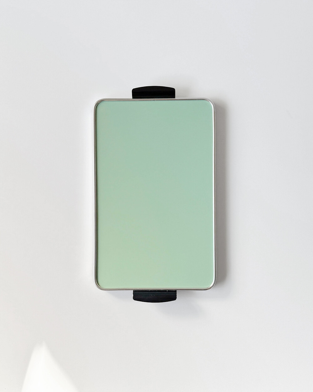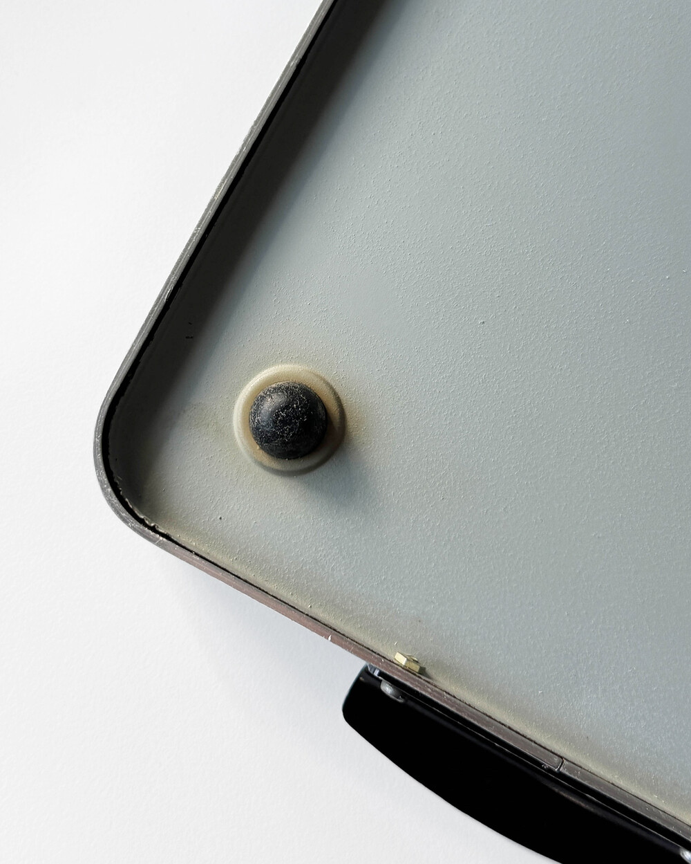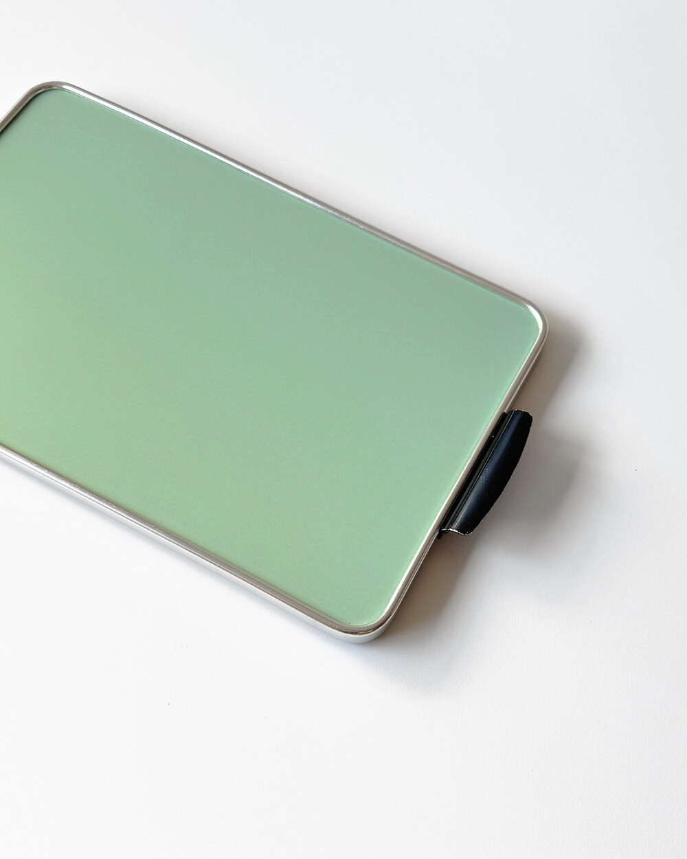 단정한 직사각 실루엣과 차분한 컬러감이 어우러진 장식용 트레이입니다. 민트색의 포마이카(Formica) 패널과 견고한 메탈 소재로 만들어졌으며, 양쪽에 블랙 핸들이 포인트로 더해졌습니다. 2-3조의 찻잔이나 6개의 글라스를 서빙할 수 있는 넉넉한 사이즈로 1960년대 서독일(DDR)의 가구회사에서 제작 되었습니다.