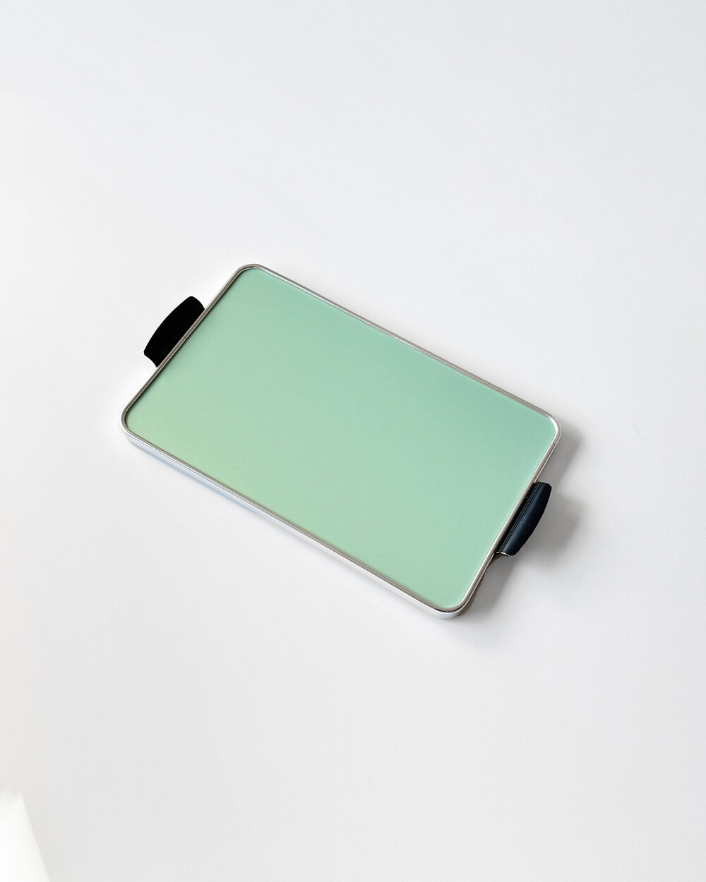 민트색 트레이는 실버 메탈로 테두리가 마감되어 있습니다.