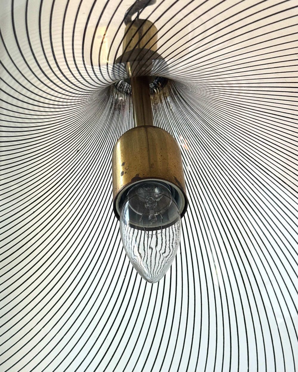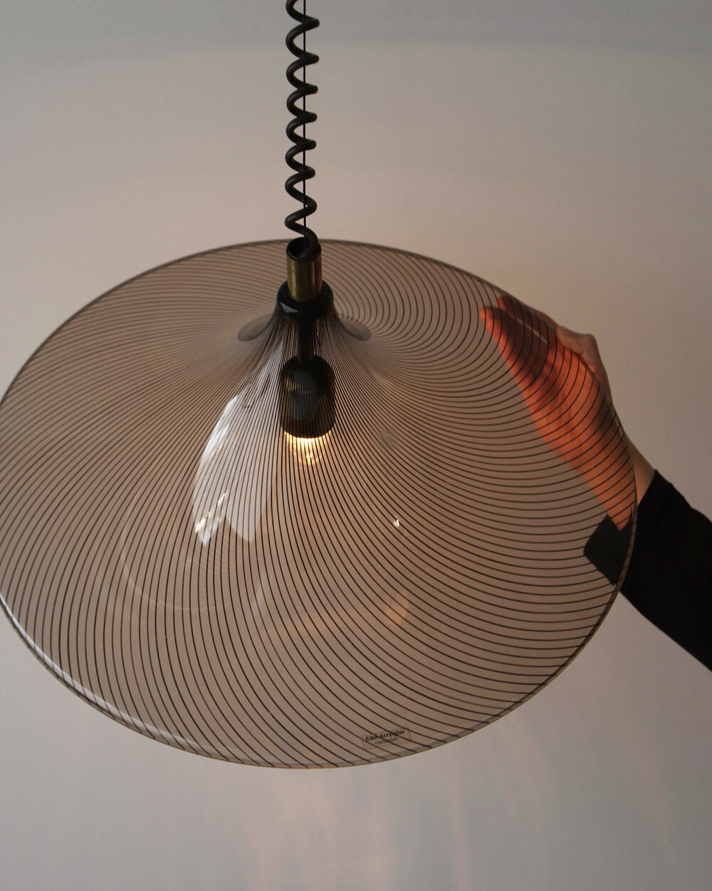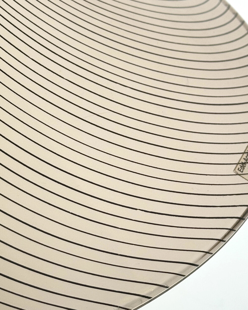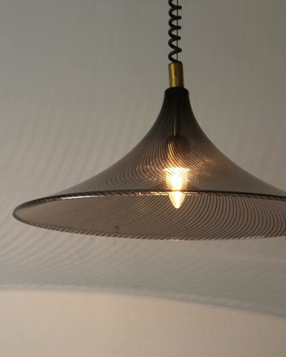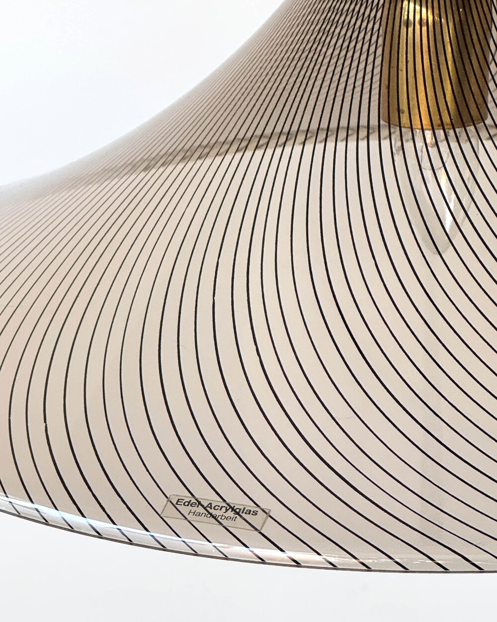 섬세하게 반복되는 라인 패턴이 투명한 브라운 아크릴 셰이드에 장식된 Edel Acrylglas사의 펜던트 조명입니다. 라벨에 남아 있는 Handarbeit 표기를 통해, 열성형과 컷팅, 연마 과정을 거친 수작업 제작임을 알 수 있습니다.