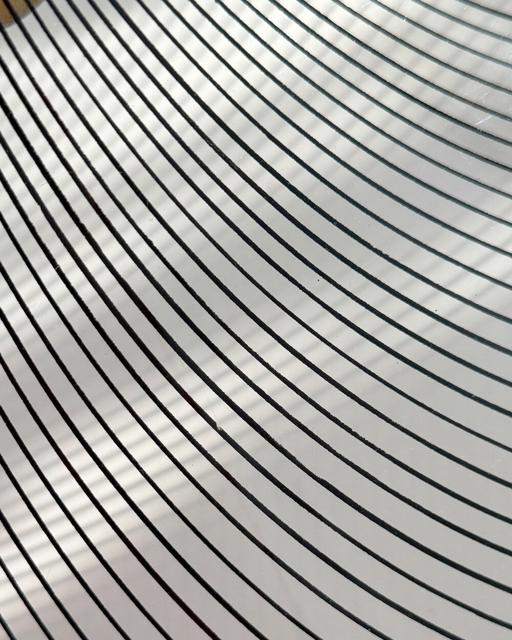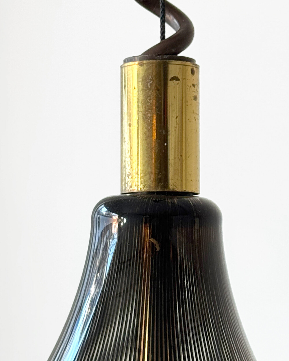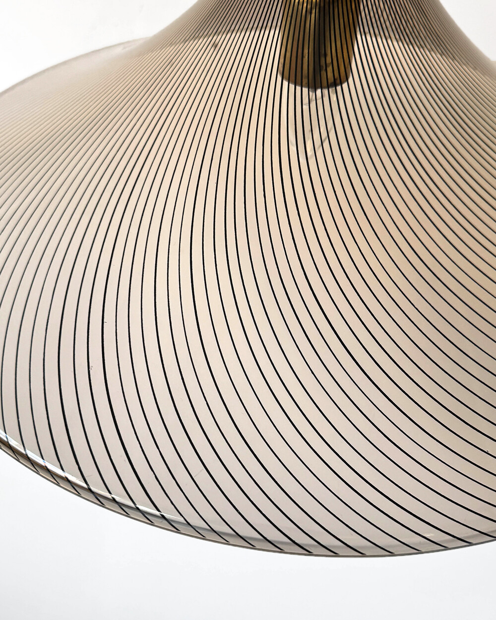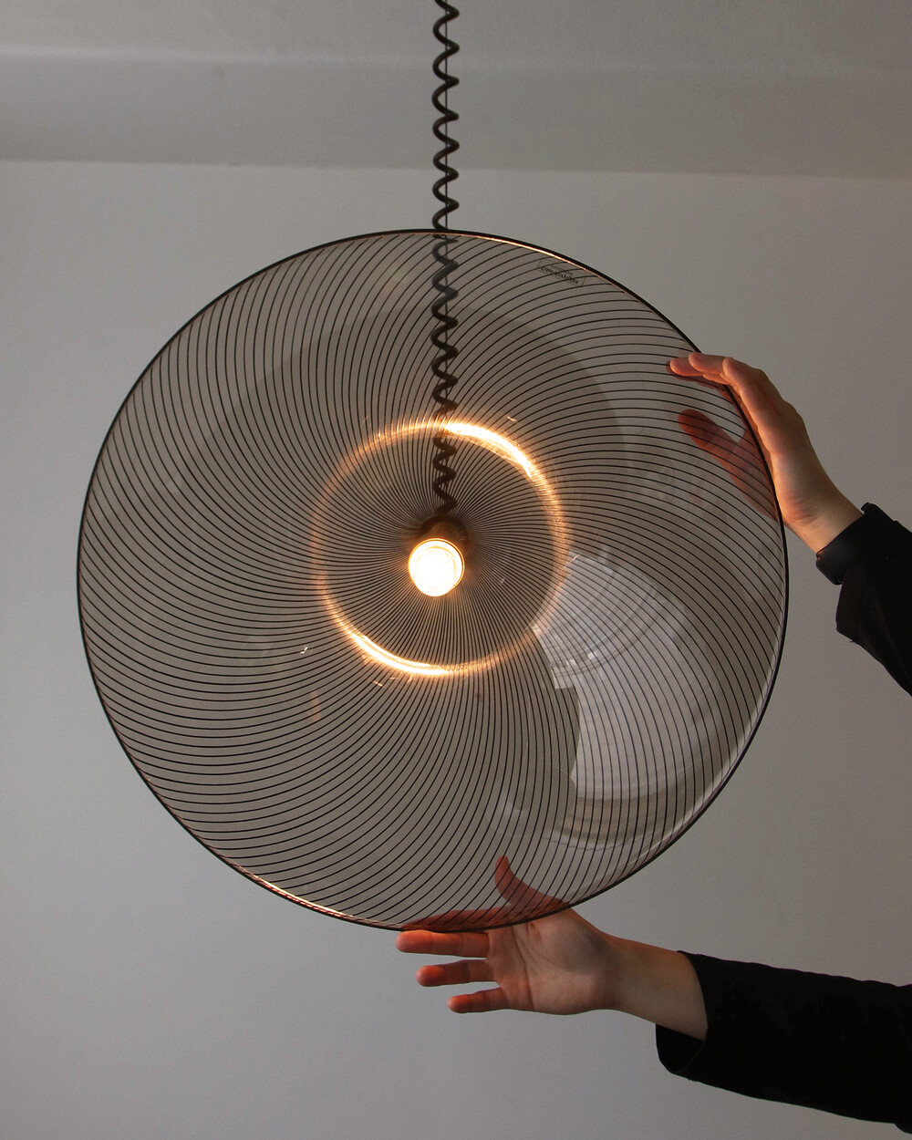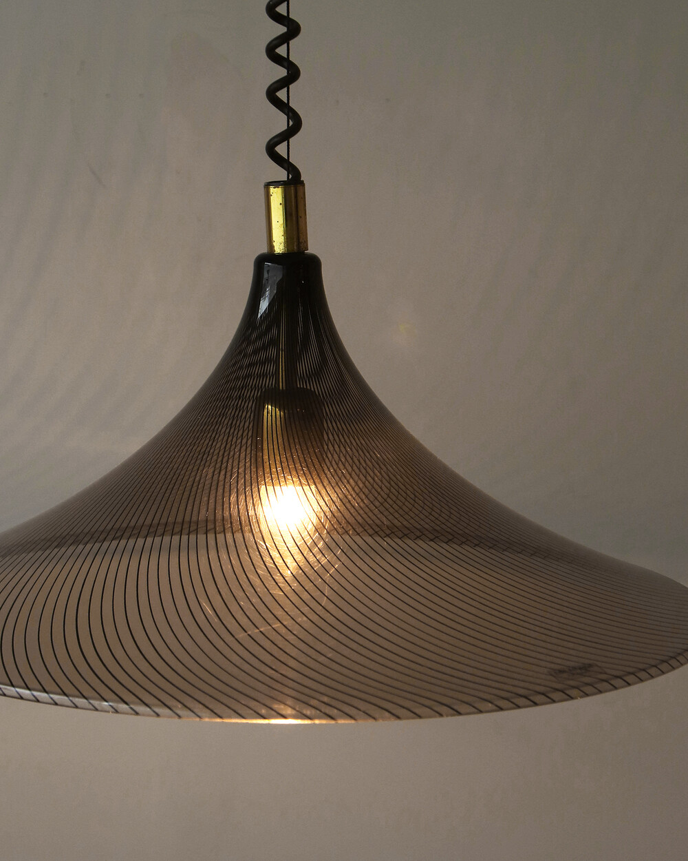 섬세하게 반복되는 라인 패턴이 투명한 브라운 아크릴 셰이드에 장식된 Edel Acrylglas사의 펜던트 조명입니다. 라벨에 남아 있는 Handarbeit 표기를 통해, 열성형과 컷팅, 연마 과정을 거친 수작업 제작임을 알 수 있습니다.