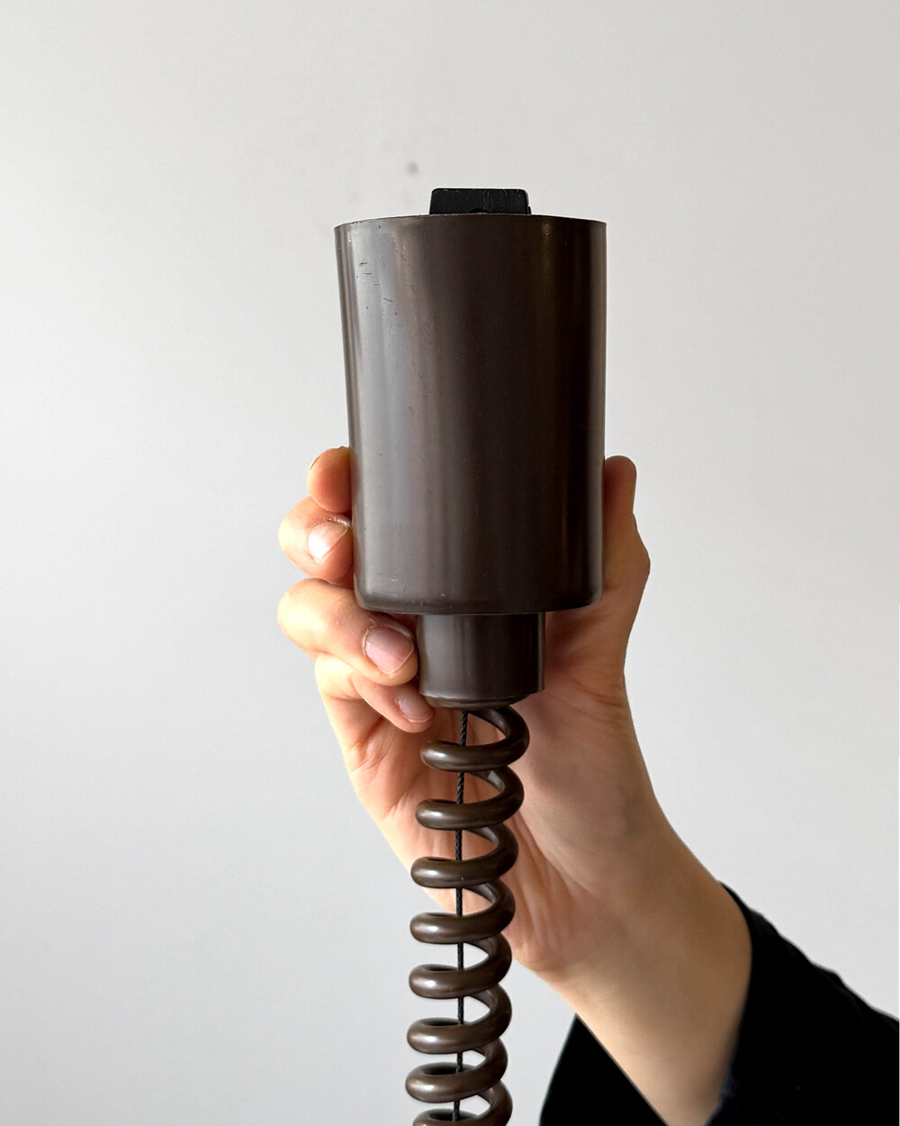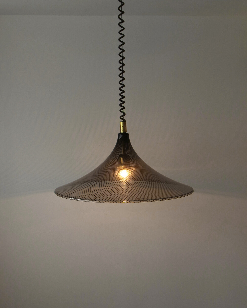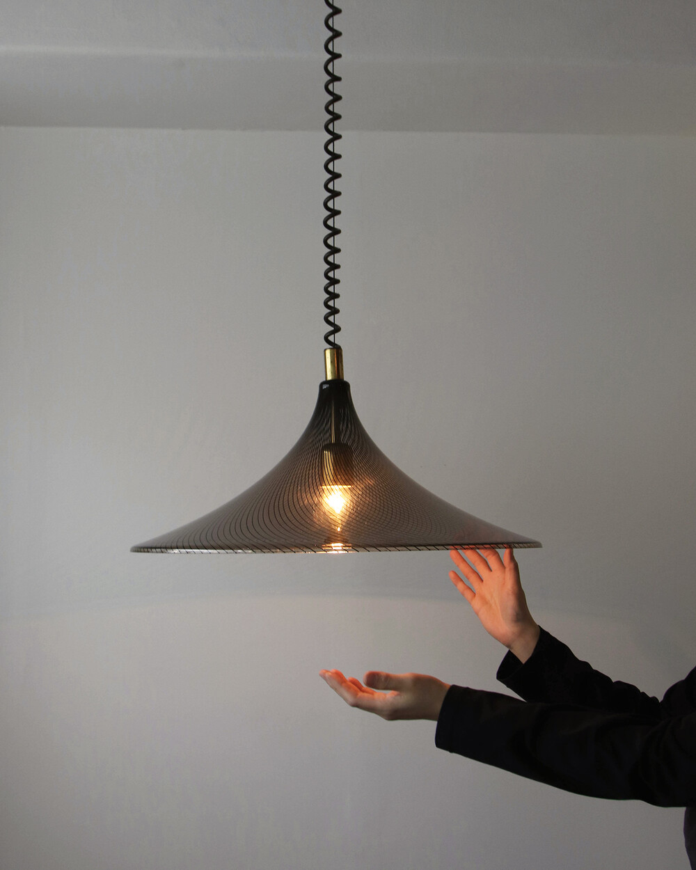 점등 시 완만한 곡선의 트럼펫 실루엣을 따라 빛이 자연스럽게 확산되며, 높이 조절이 가능한 블랙 컬러의 스프링 코드와 브라스 톤 소켓 디테일이 더해져 1970년대 독일 빈티지 조명 특유의 기능적이면서도 클래식한 분위기를 잘 담고 있습니다.