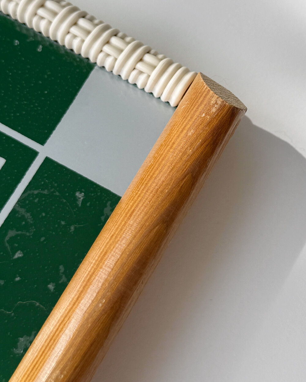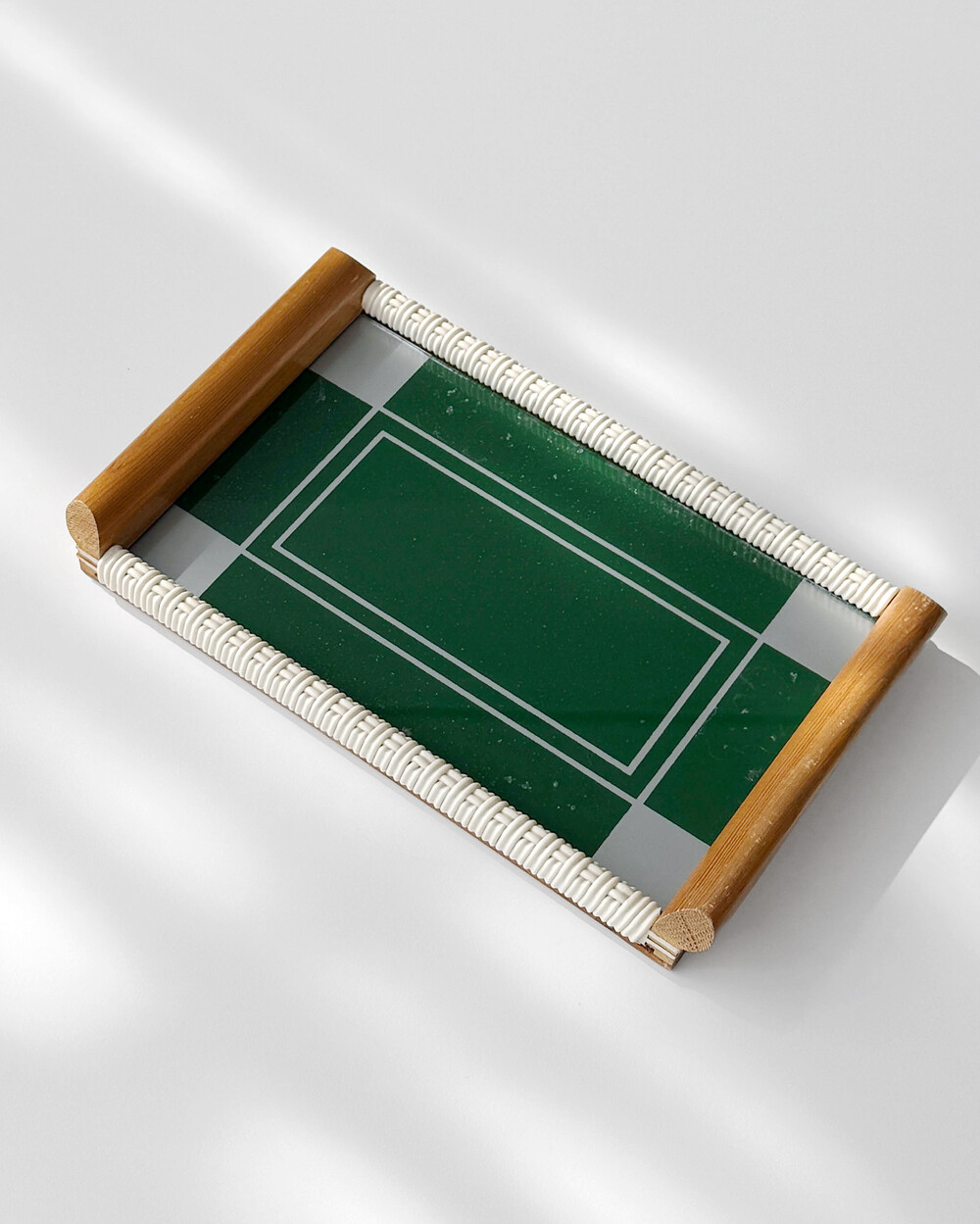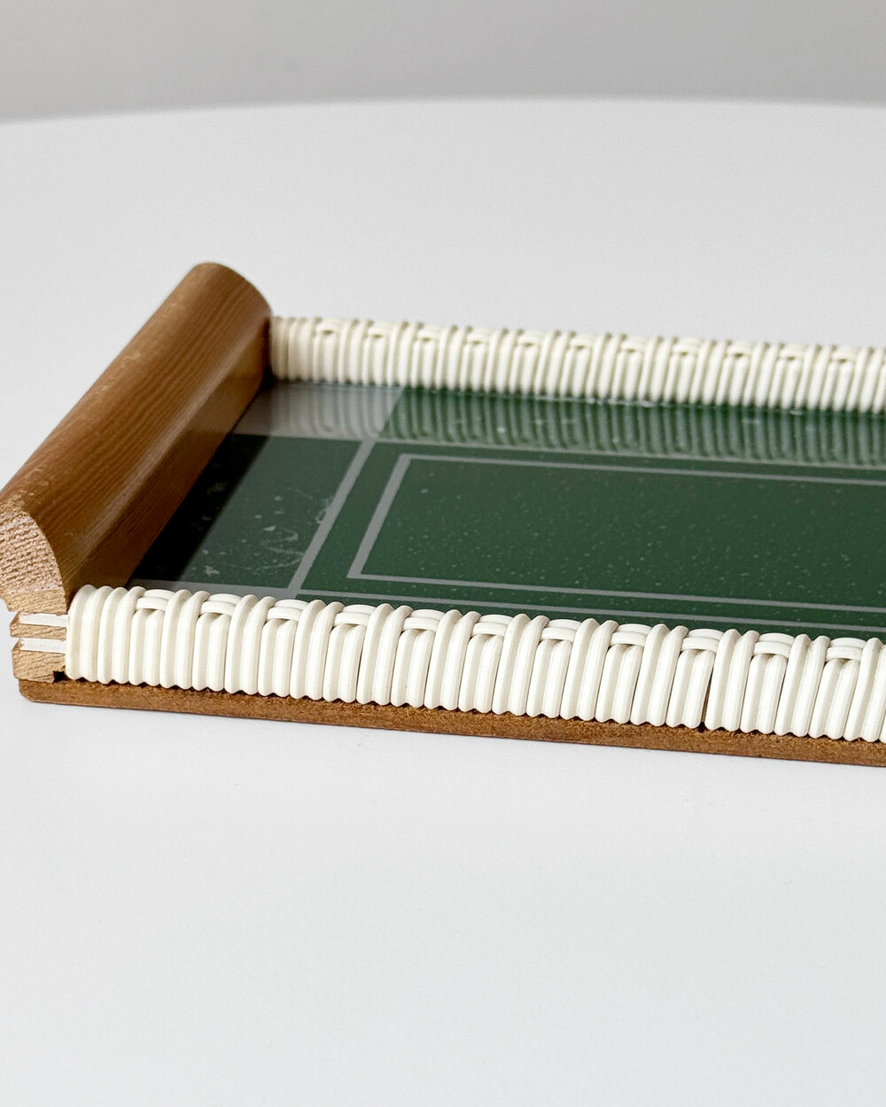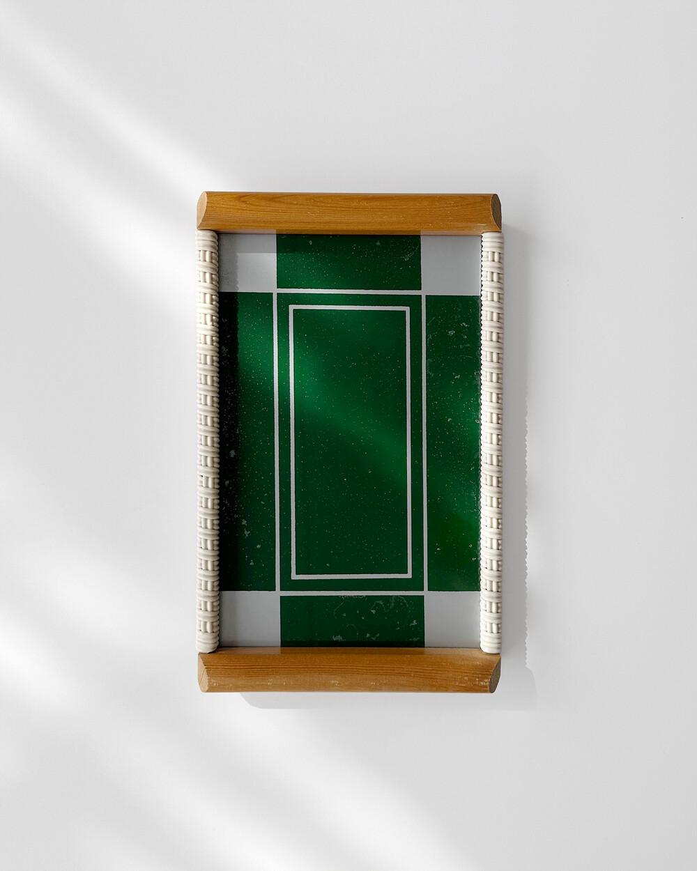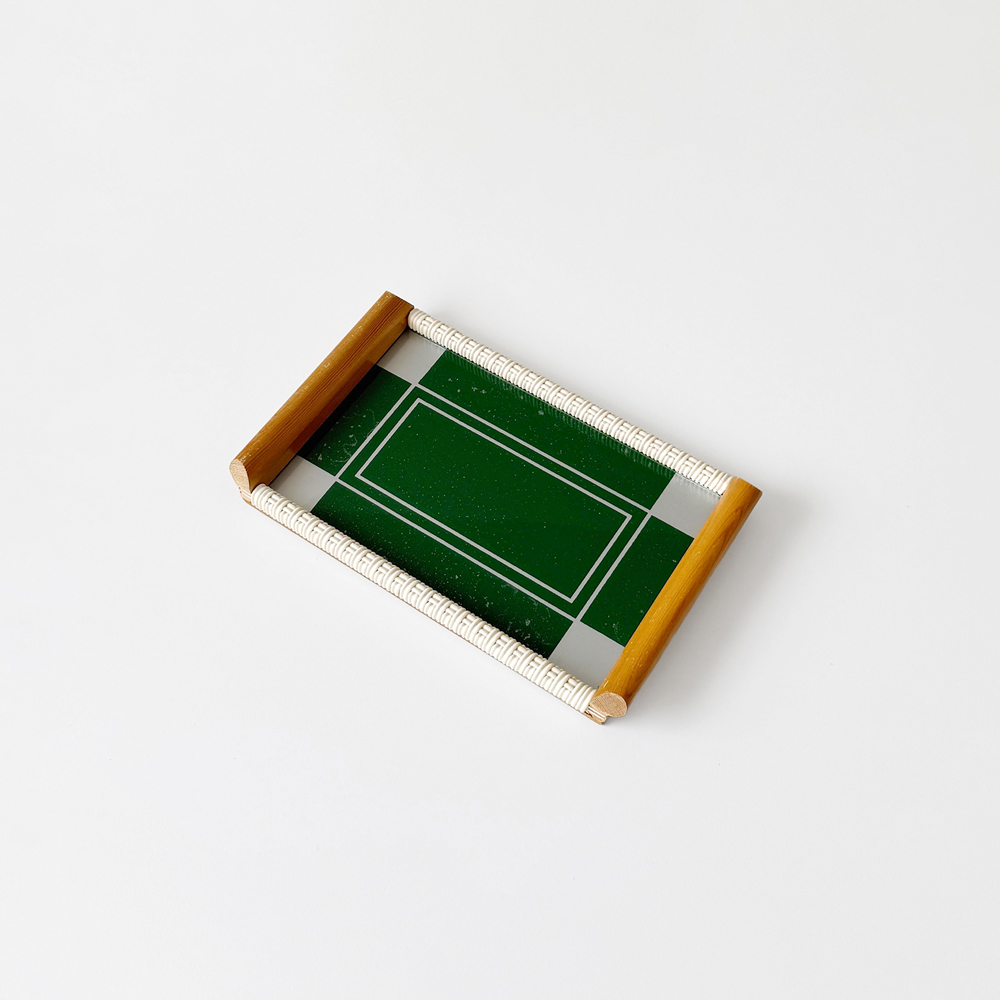 위빙 장식이 더해진 우드 프레임과 짙은 그린 컬러 글라스가 조화를 이루고 있으며, 데스크나 키친 등 다양한 공간에서 쓰임이 좋은 미디엄 사이즈입니다.