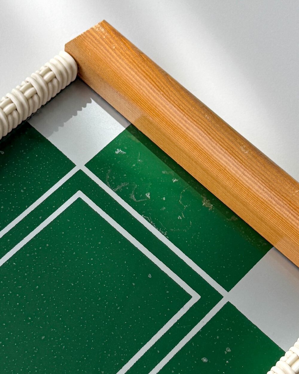 글라스 패널 아래에 반짝이는 형태의 반점과 실크스크린 패턴에 남은 가는 크랙들이 보입니다.