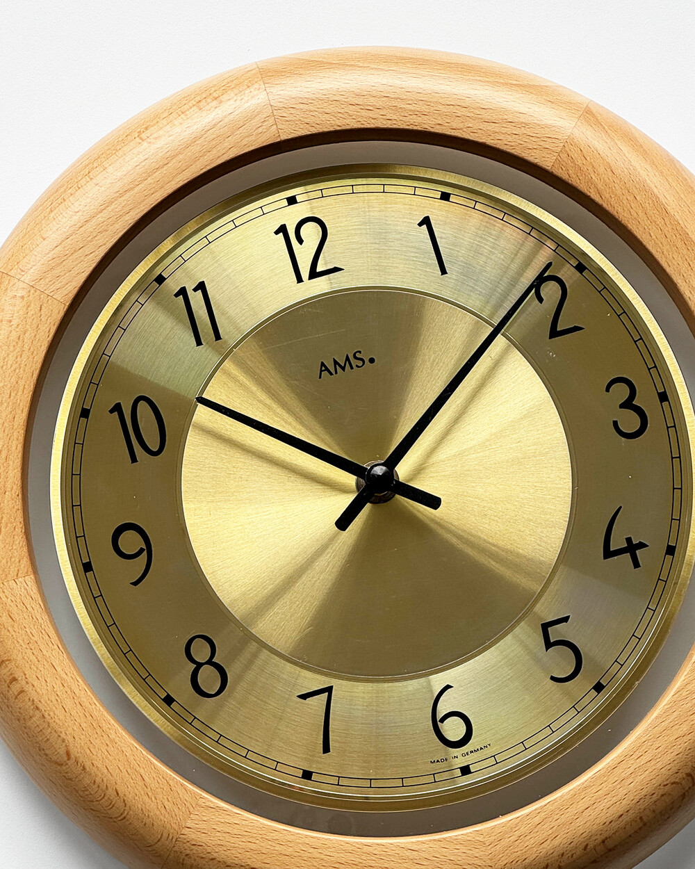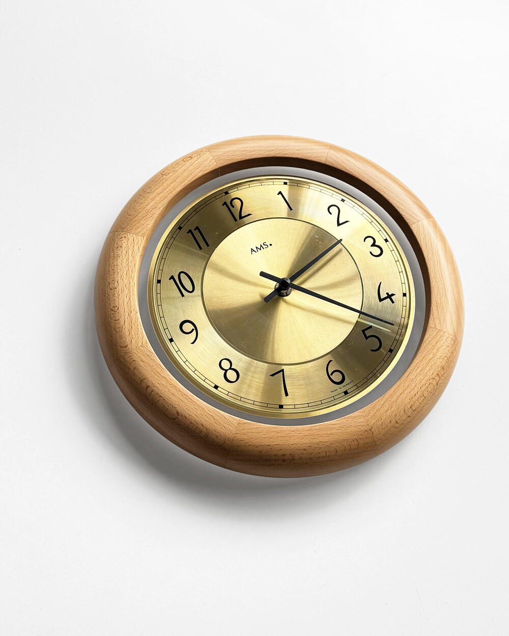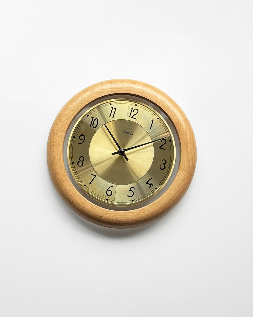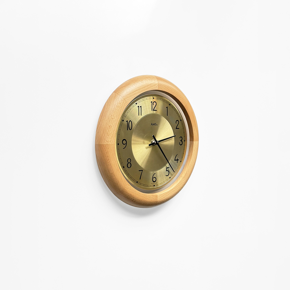 부드러운 색감의 너도밤 우드 프레임과 차분한 골드 톤 메탈 다이얼이 조화를 이루는 1990년대 독일 AMS 벽시계입니다. 심플한 숫자 인덱스와 단정한 소재의 균형이 돋보이며, 공간에 자연스럽게 어우러지는 디자인입니다.