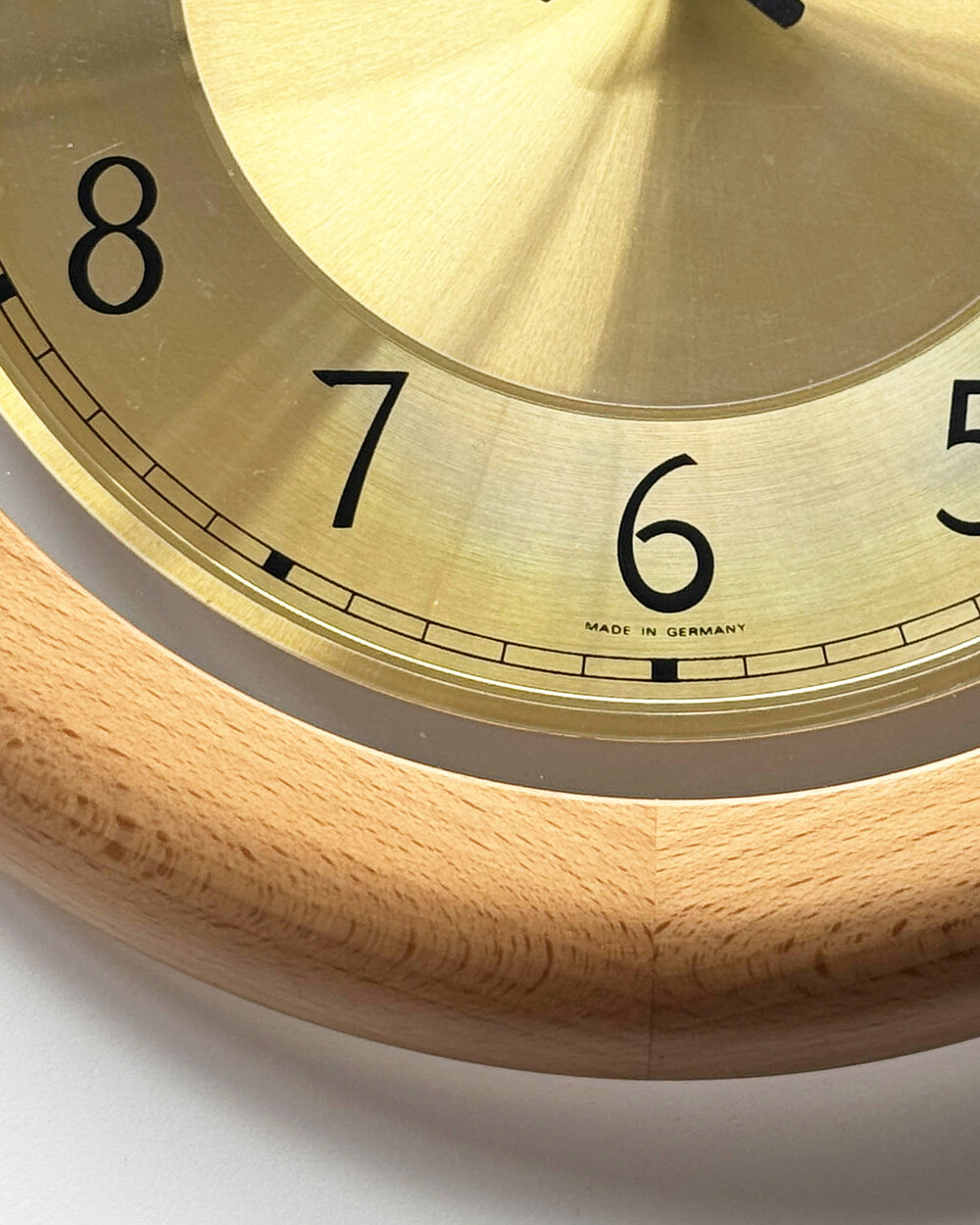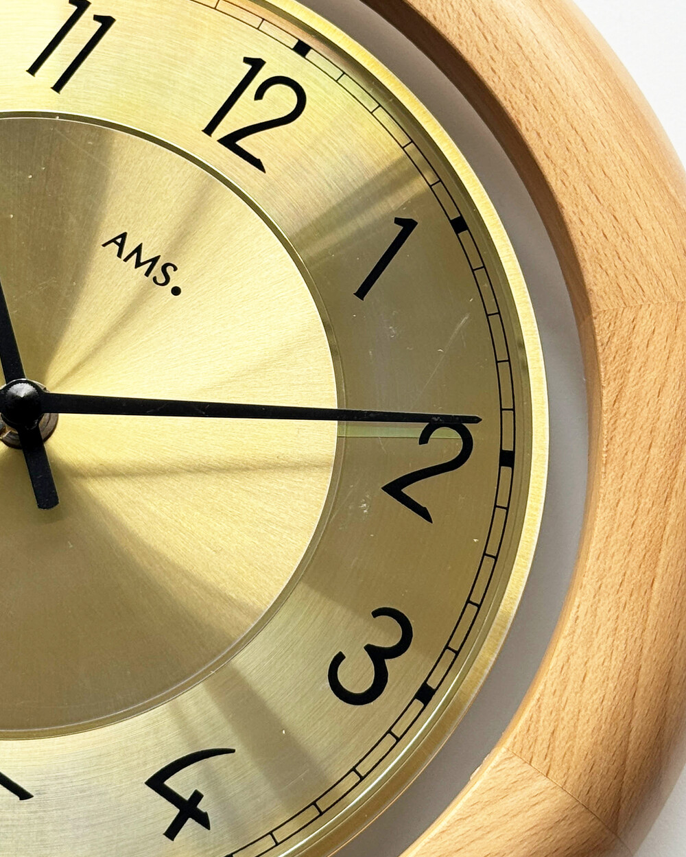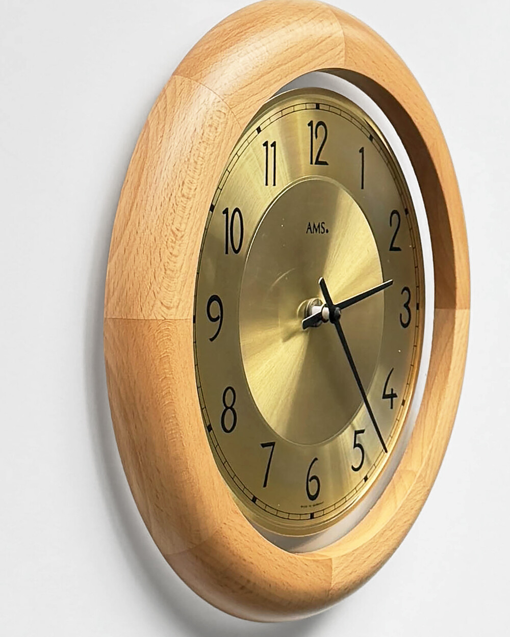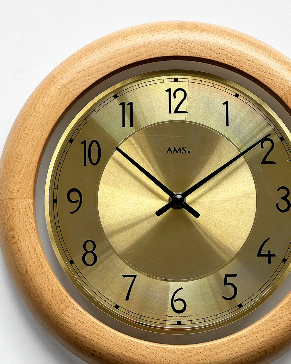 부드러운 색감의 너도밤 우드 프레임과 차분한 골드 톤 메탈 다이얼이 조화를 이루는 1990년대 독일 AMS 벽시계입니다. 심플한 숫자 인덱스와 단정한 소재의 균형이 돋보이며, 공간에 자연스럽게 어우러지는 디자인입니다.