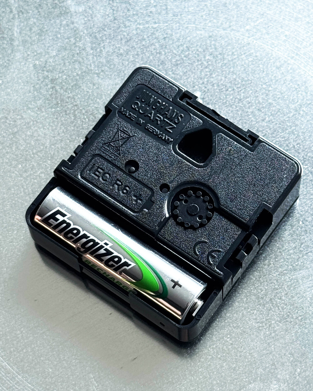 독일 Junhans 사의 무브먼트가 장착되어 있으며 뒷면에는 벽면에 걸 수 있는 홈이 있습니다.