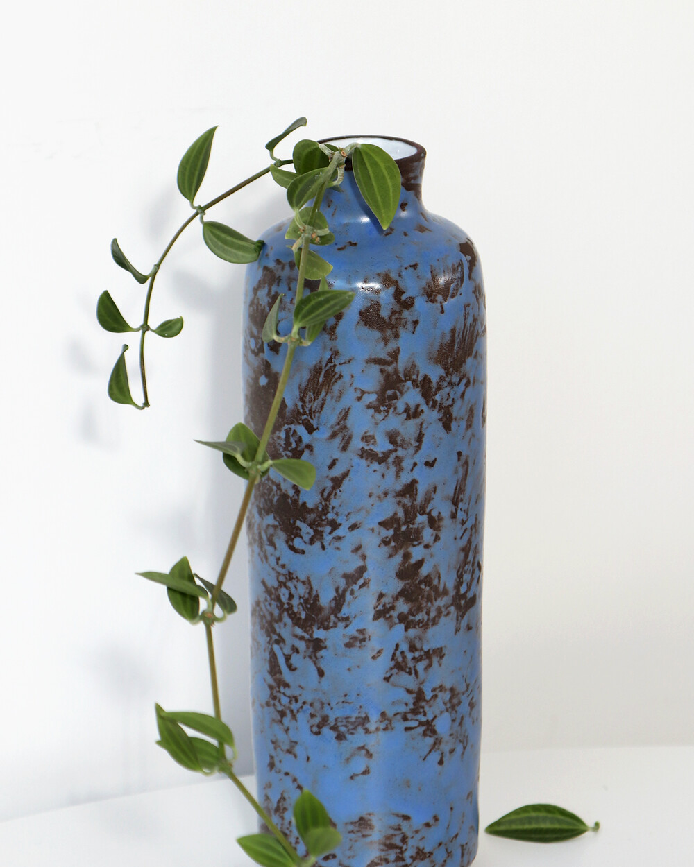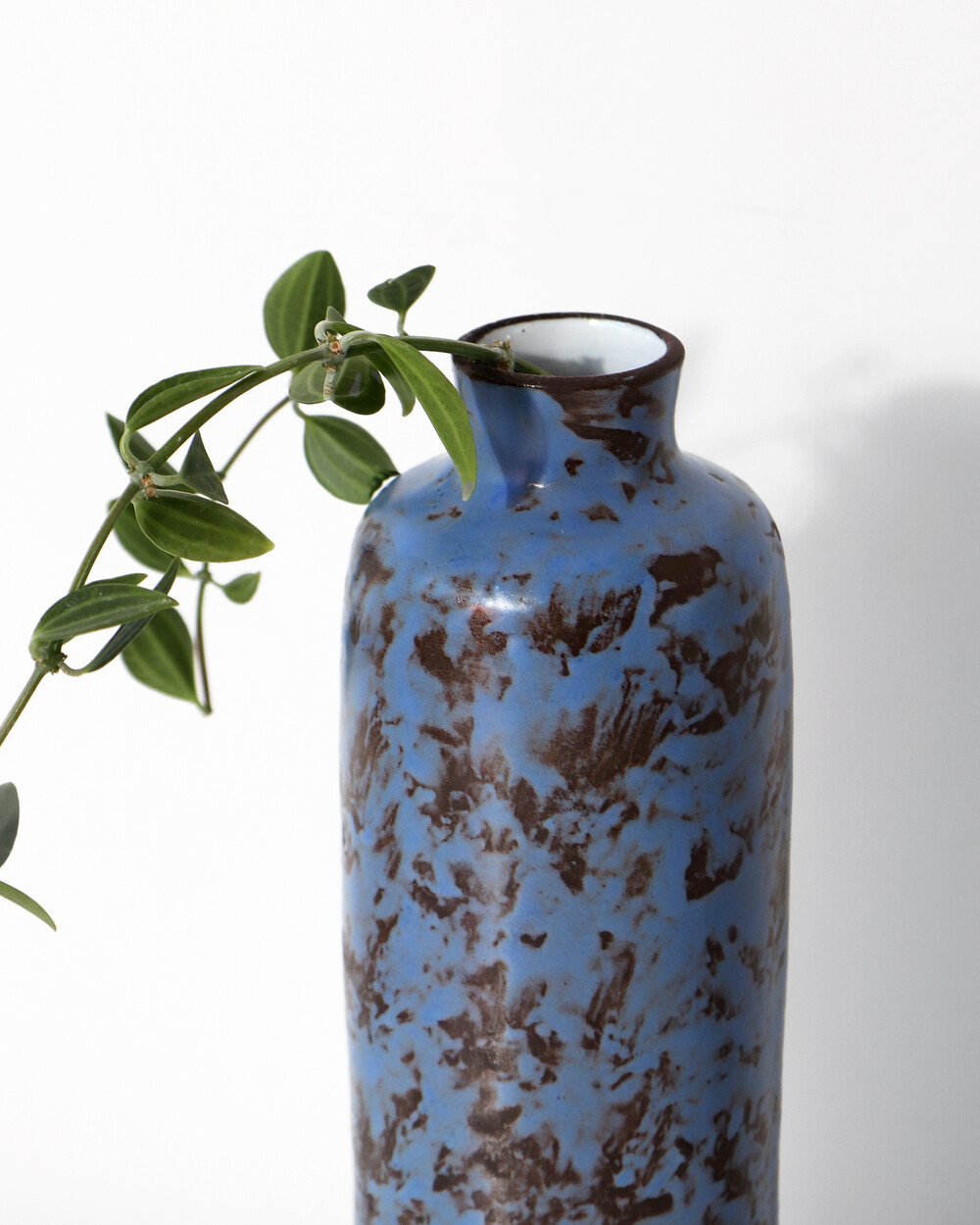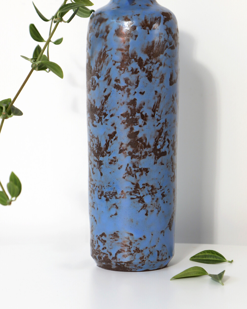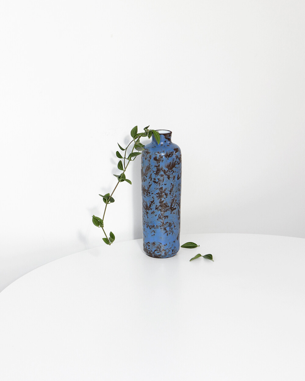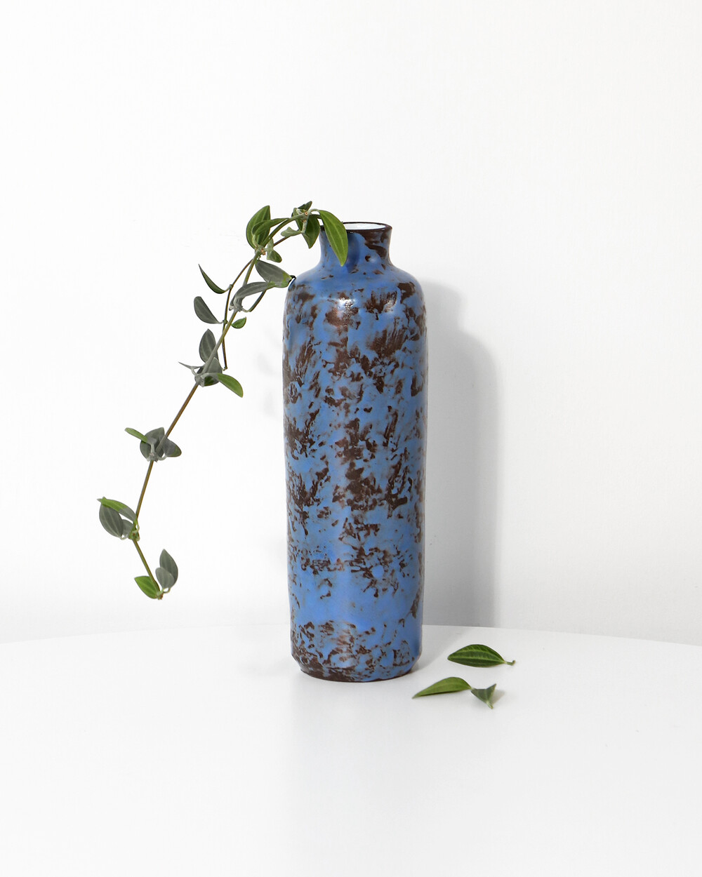 차분하면서도 따뜻함이 감도는 푸른색과 브라운 유약이 독특하게 어우러진 화병입니다. 작고 동그란 입구와 길고 단순한 형태감이 돋보이며, 1960년대 독일에서 테라코타 소재로 제작되었습니다.