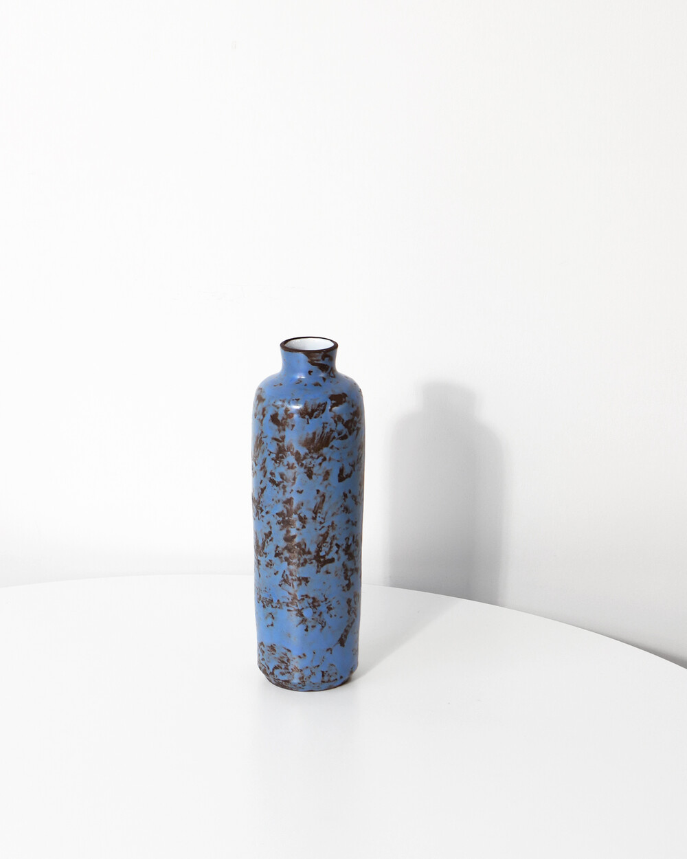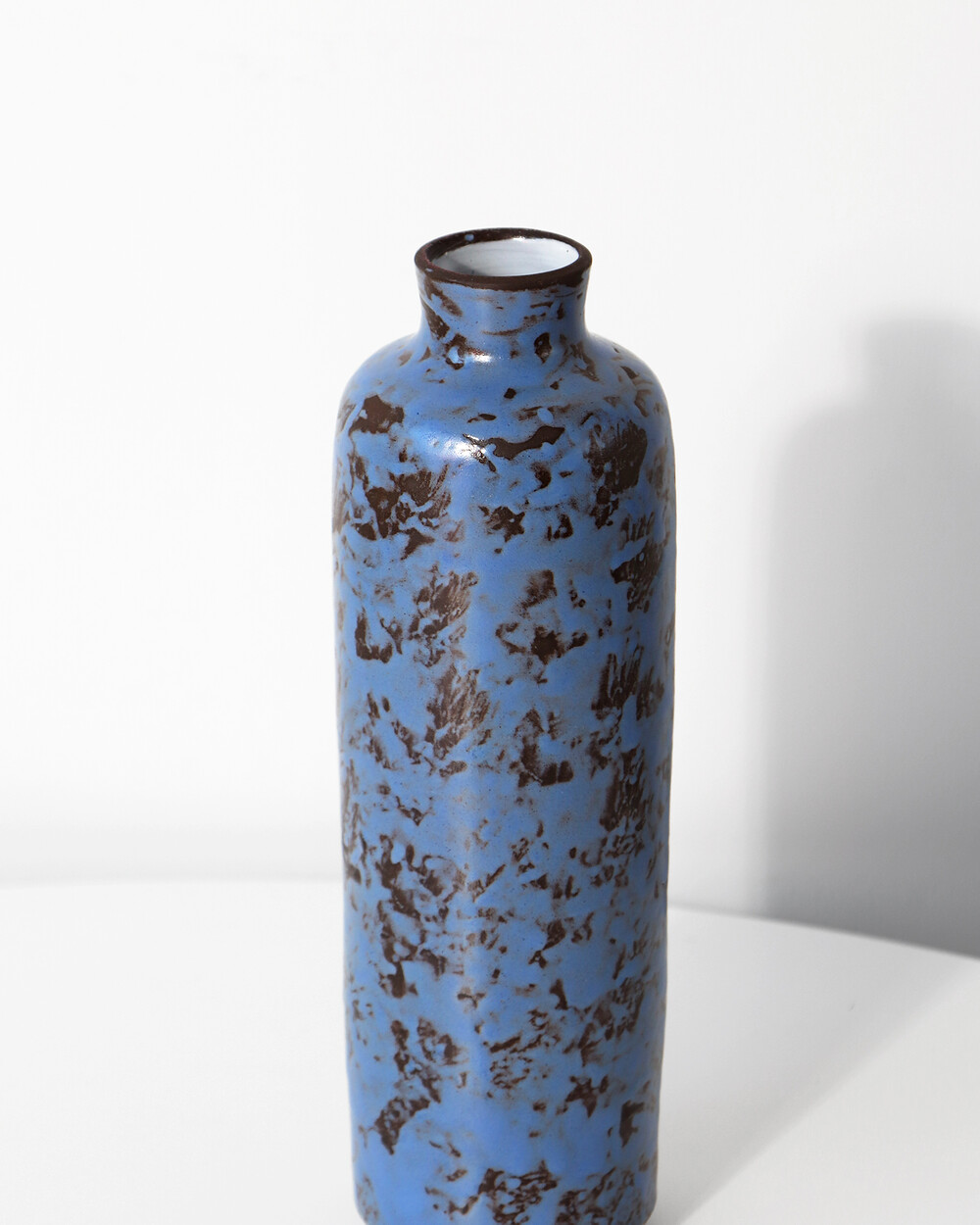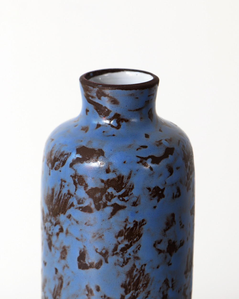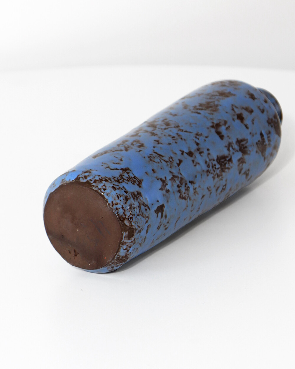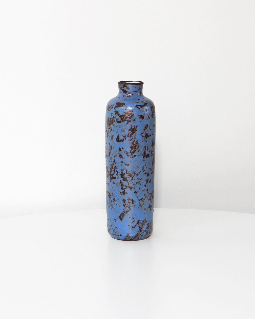 차분하면서도 따뜻함이 감도는 푸른색과 브라운 유약이 독특하게 어우러진 화병입니다. 작고 동그란 입구와 길고 단순한 형태감이 돋보이며, 1960년대 독일에서 테라코타 소재로 제작되었습니다.