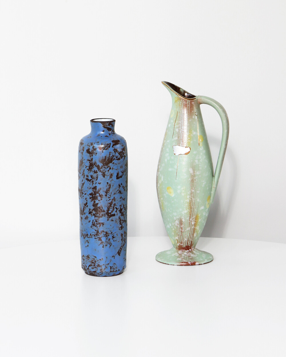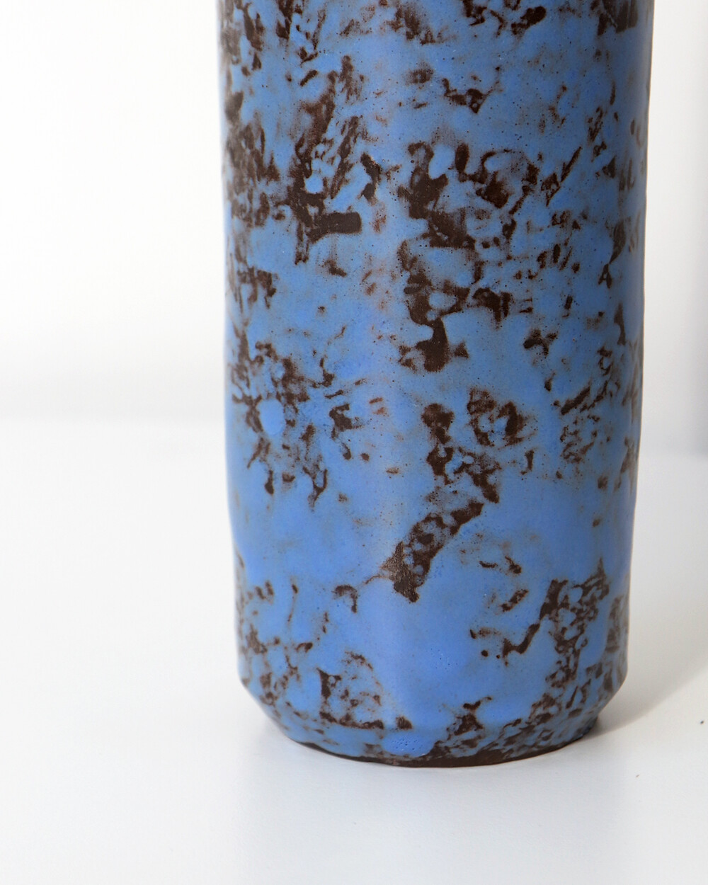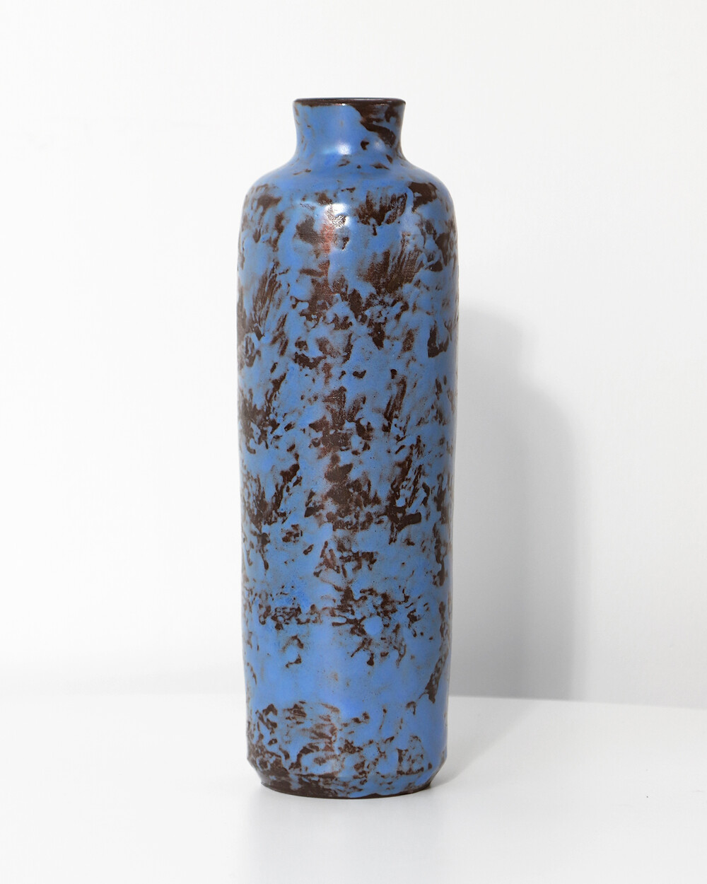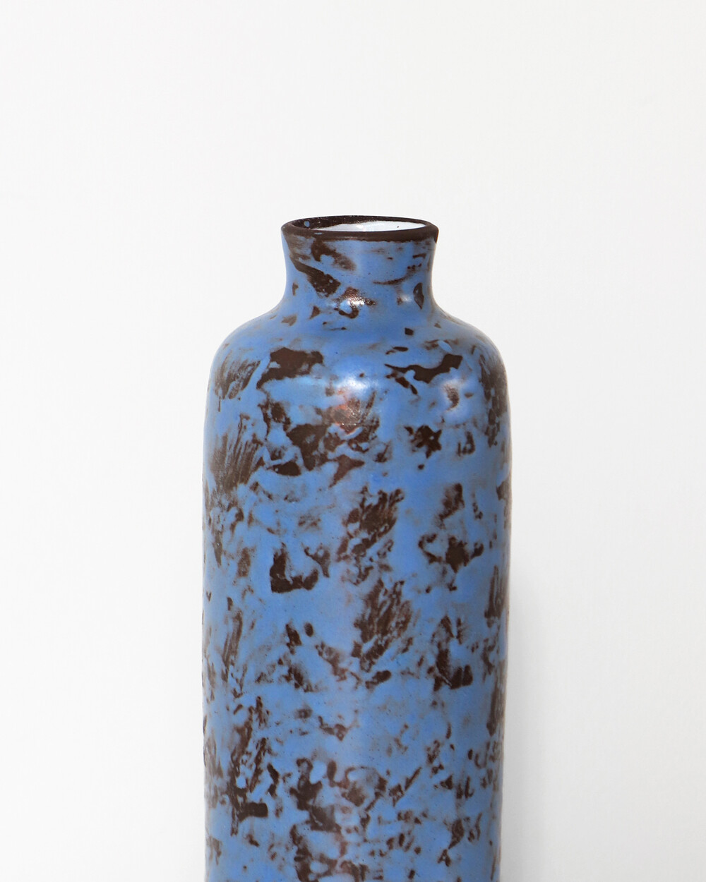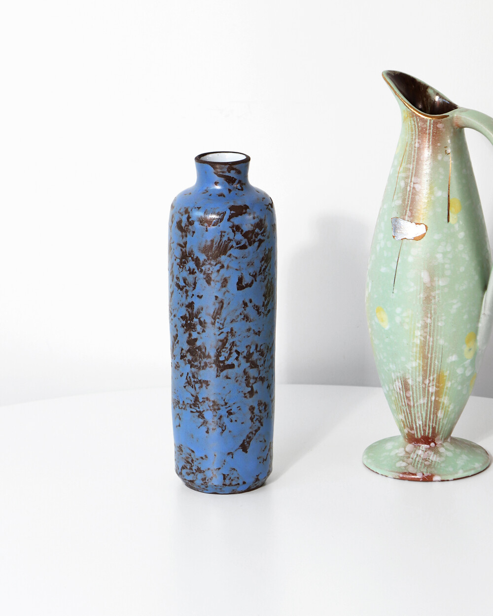 차분하면서도 따뜻함이 감도는 푸른색과 브라운 유약이 독특하게 어우러진 화병입니다. 작고 동그란 입구와 길고 단순한 형태감이 돋보이며, 1960년대 독일에서 테라코타 소재로 제작되었습니다.