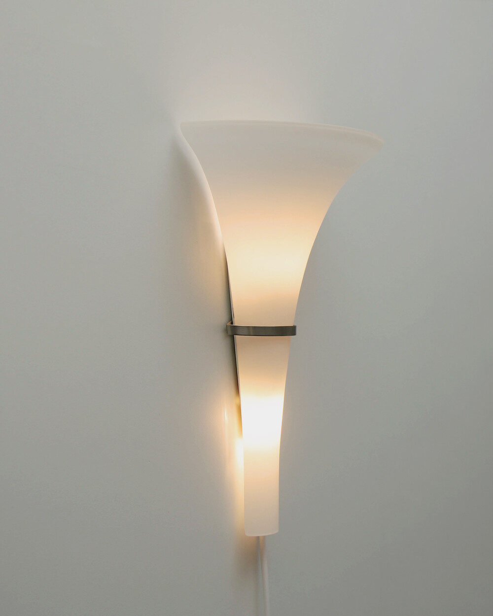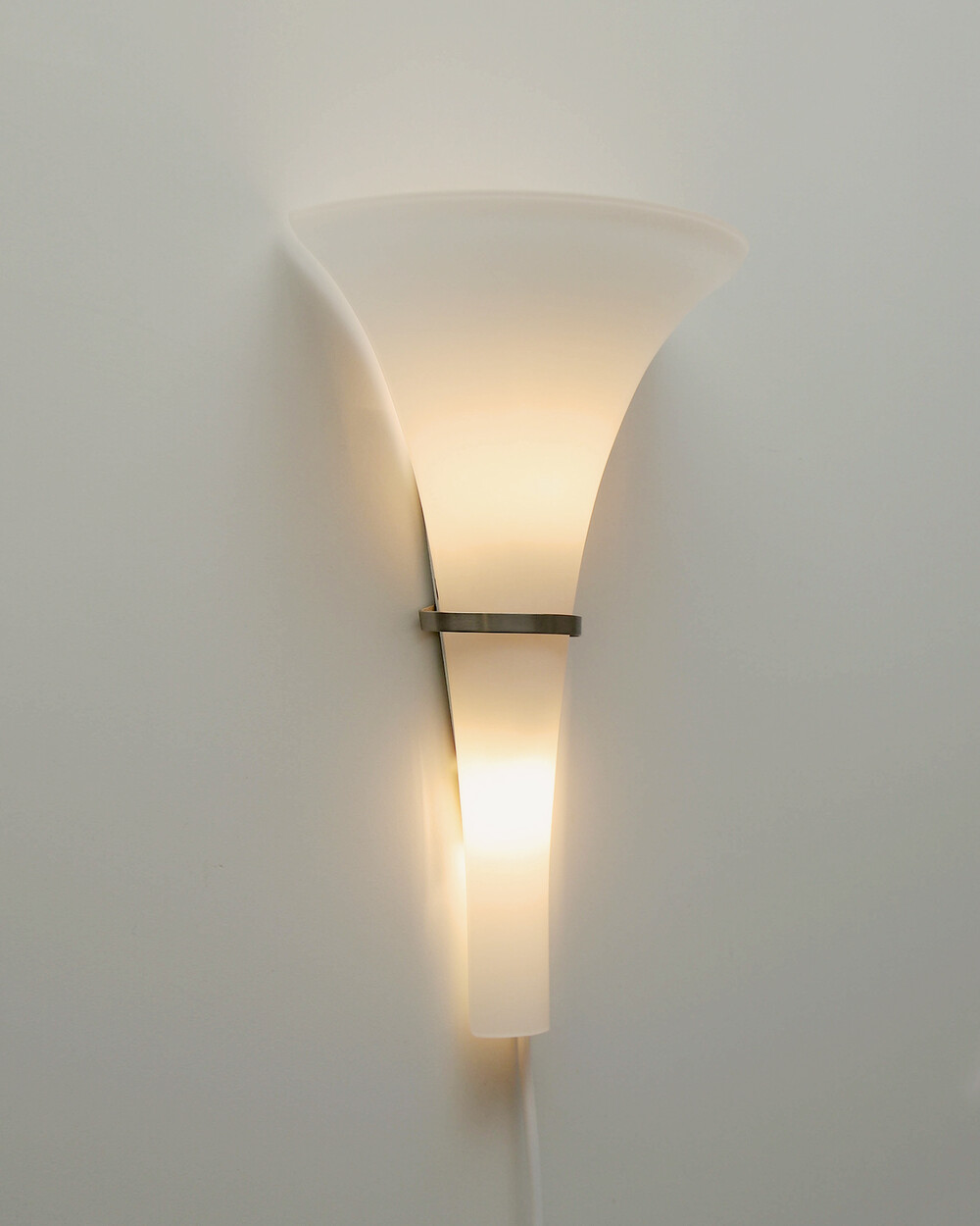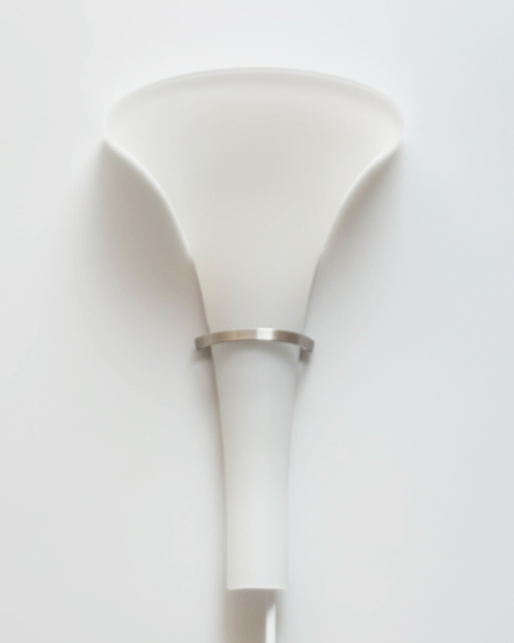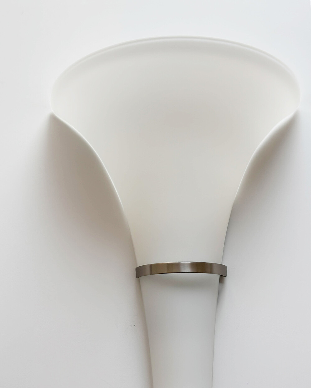 부드럽게 펼쳐지는 긴 나팔 실루엣의 매트하고 차분한 텍스처를 지닌 유백색 글라스로 이루어진 1980년대 독일 월램프입니다.