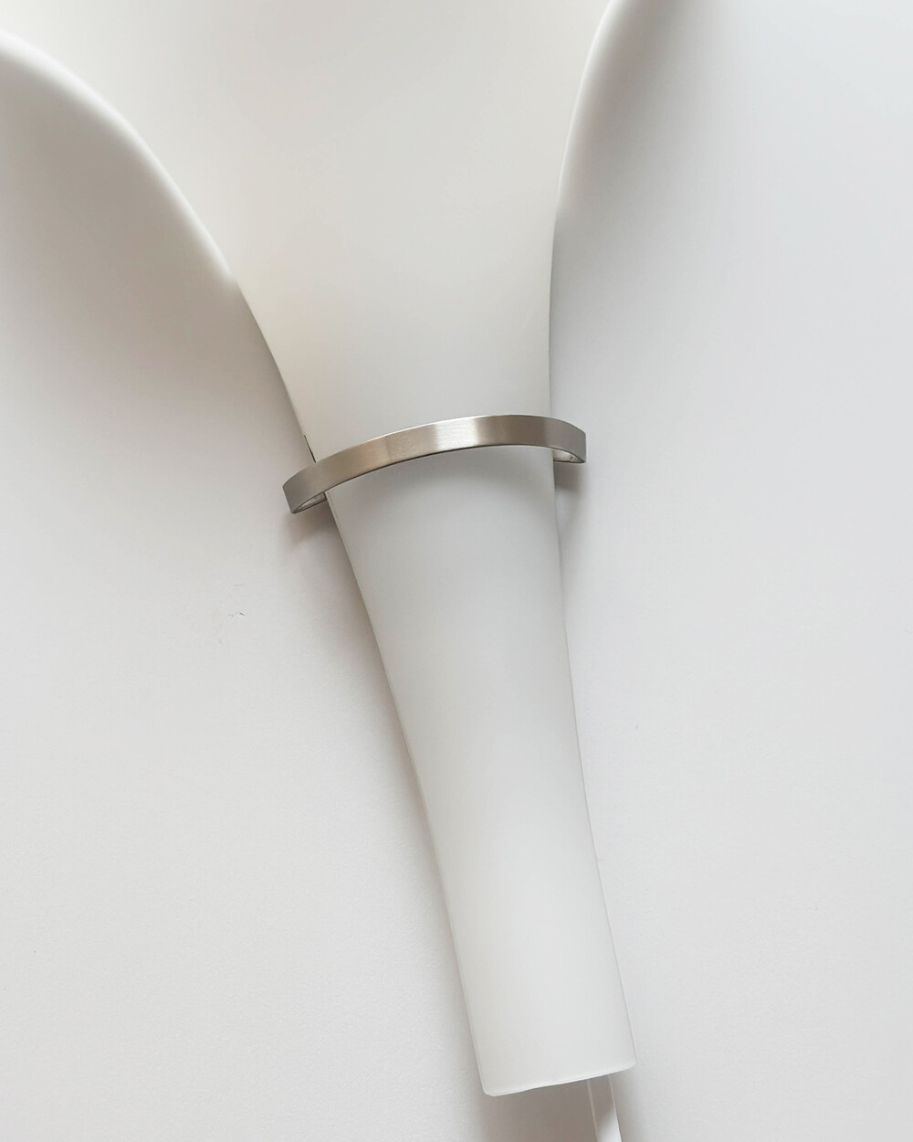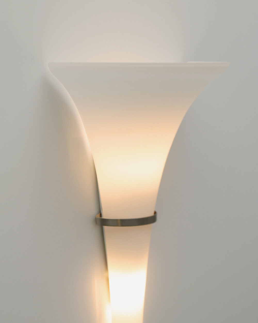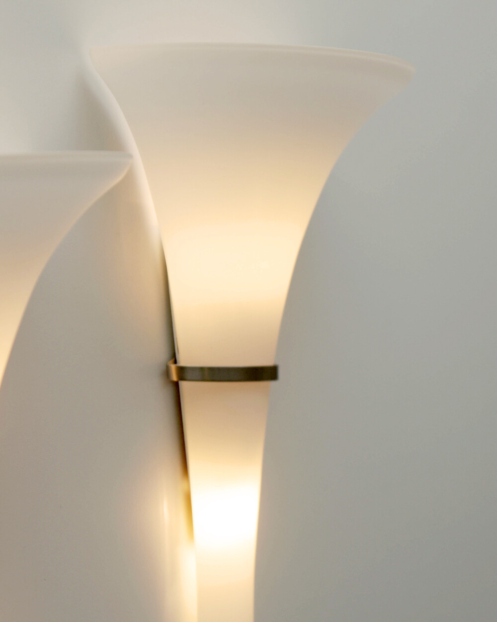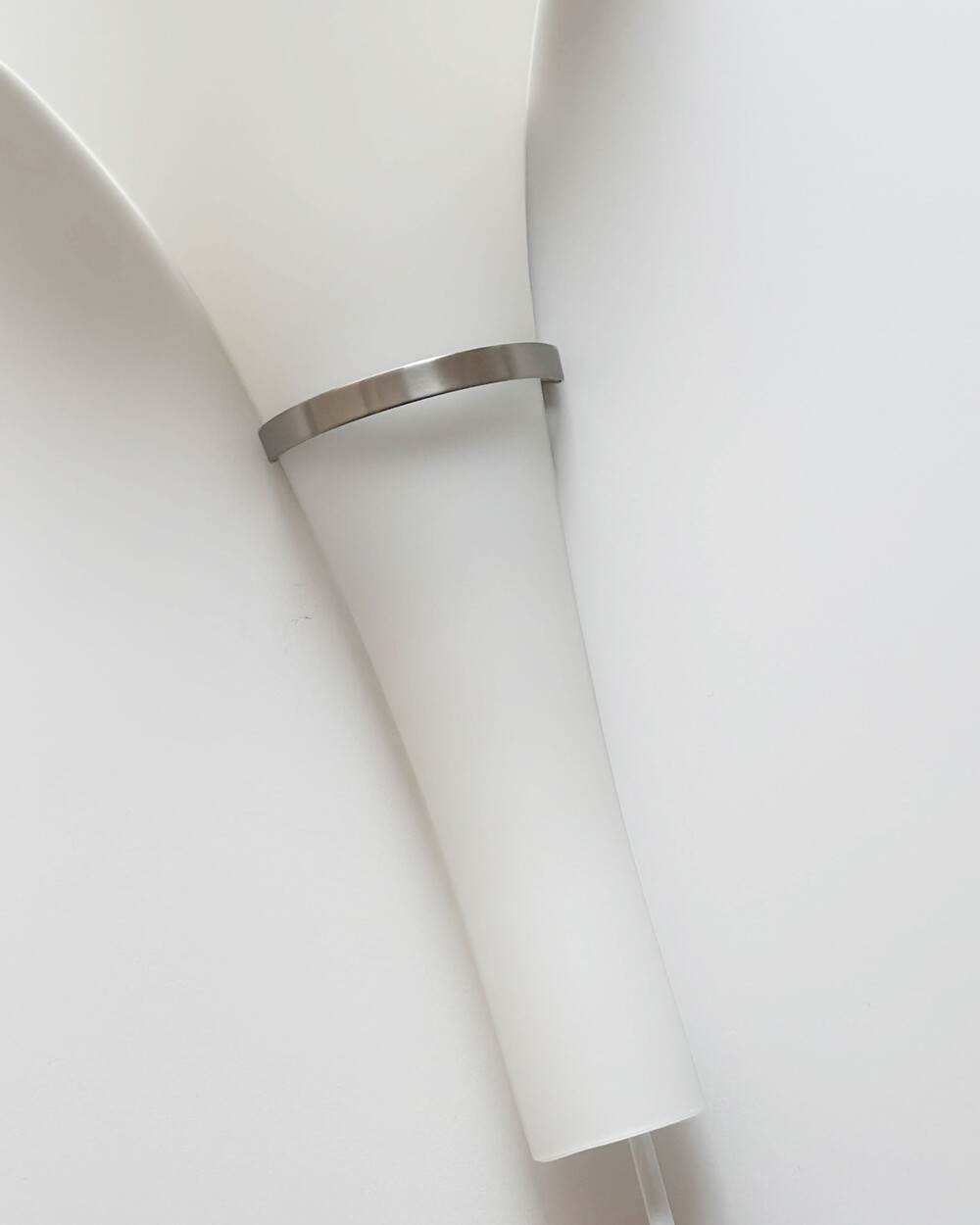 부드럽게 펼쳐지는 긴 나팔 실루엣의 매트하고 차분한 텍스처를 지닌 유백색 글라스로 이루어진 1980년대 독일 월램프입니다.