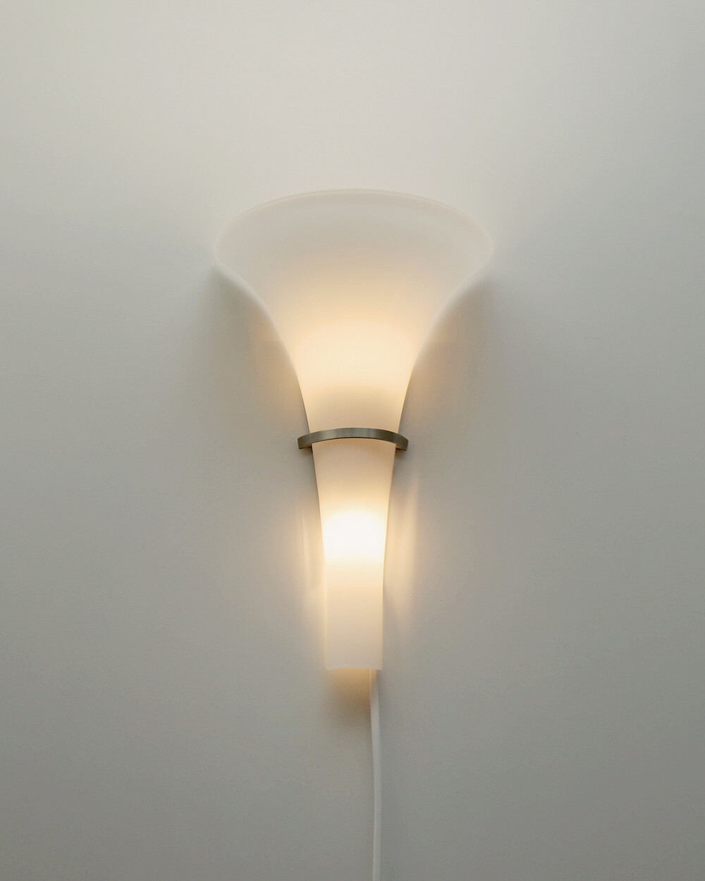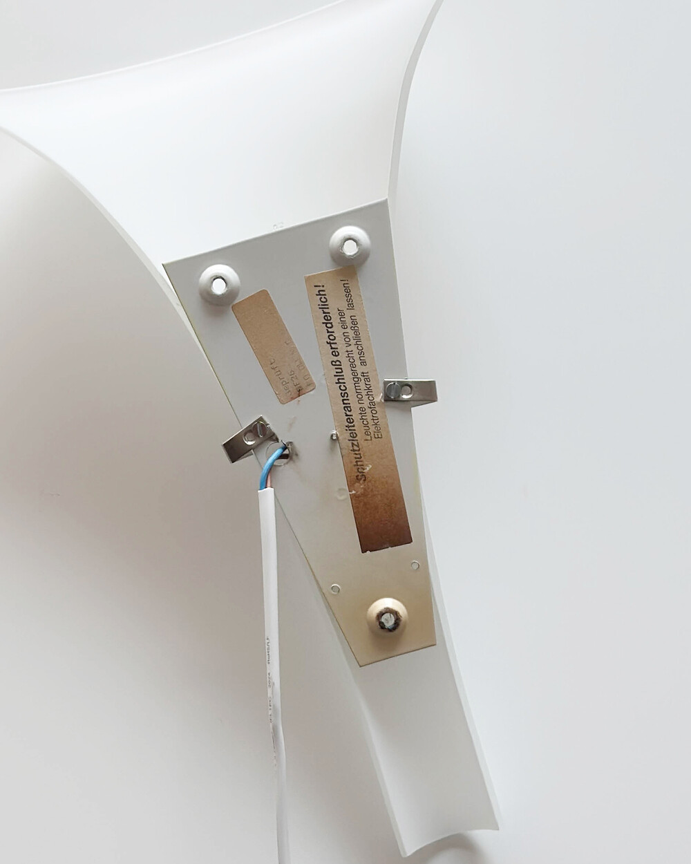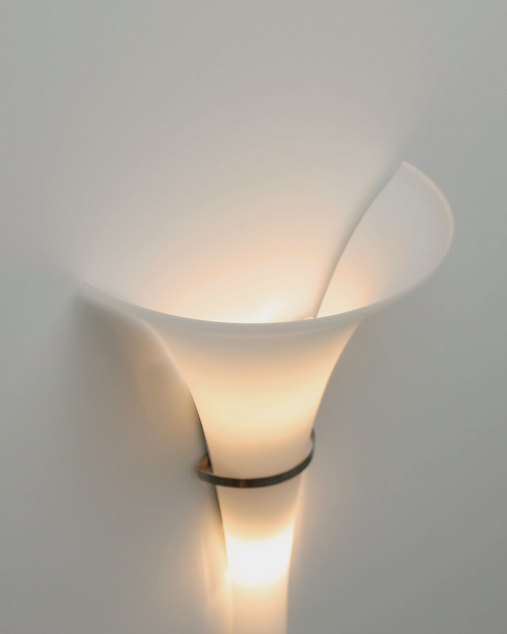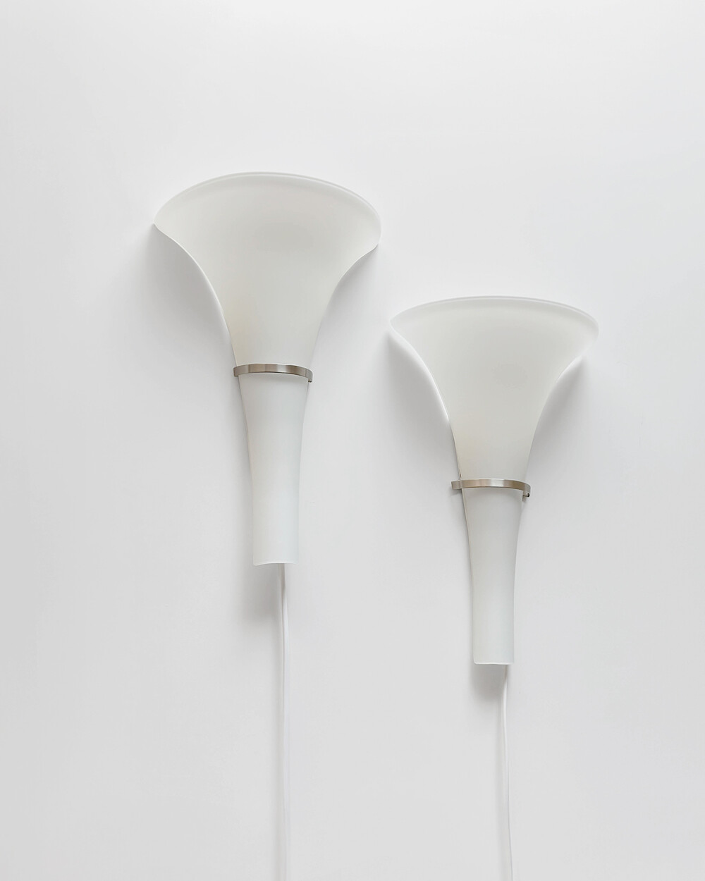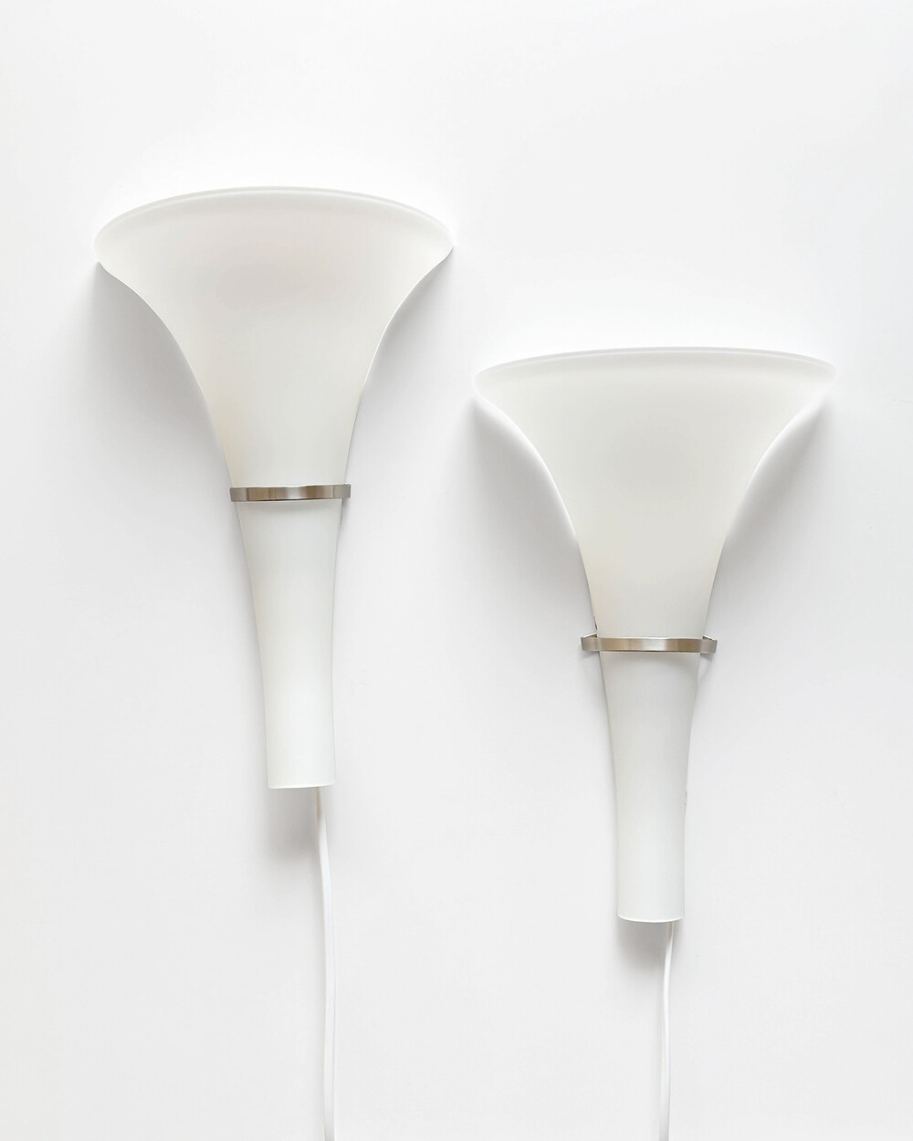부드럽게 펼쳐지는 긴 나팔 실루엣의 매트하고 차분한 텍스처를 지닌 유백색 글라스로 이루어진 1980년대 독일 월램프입니다.