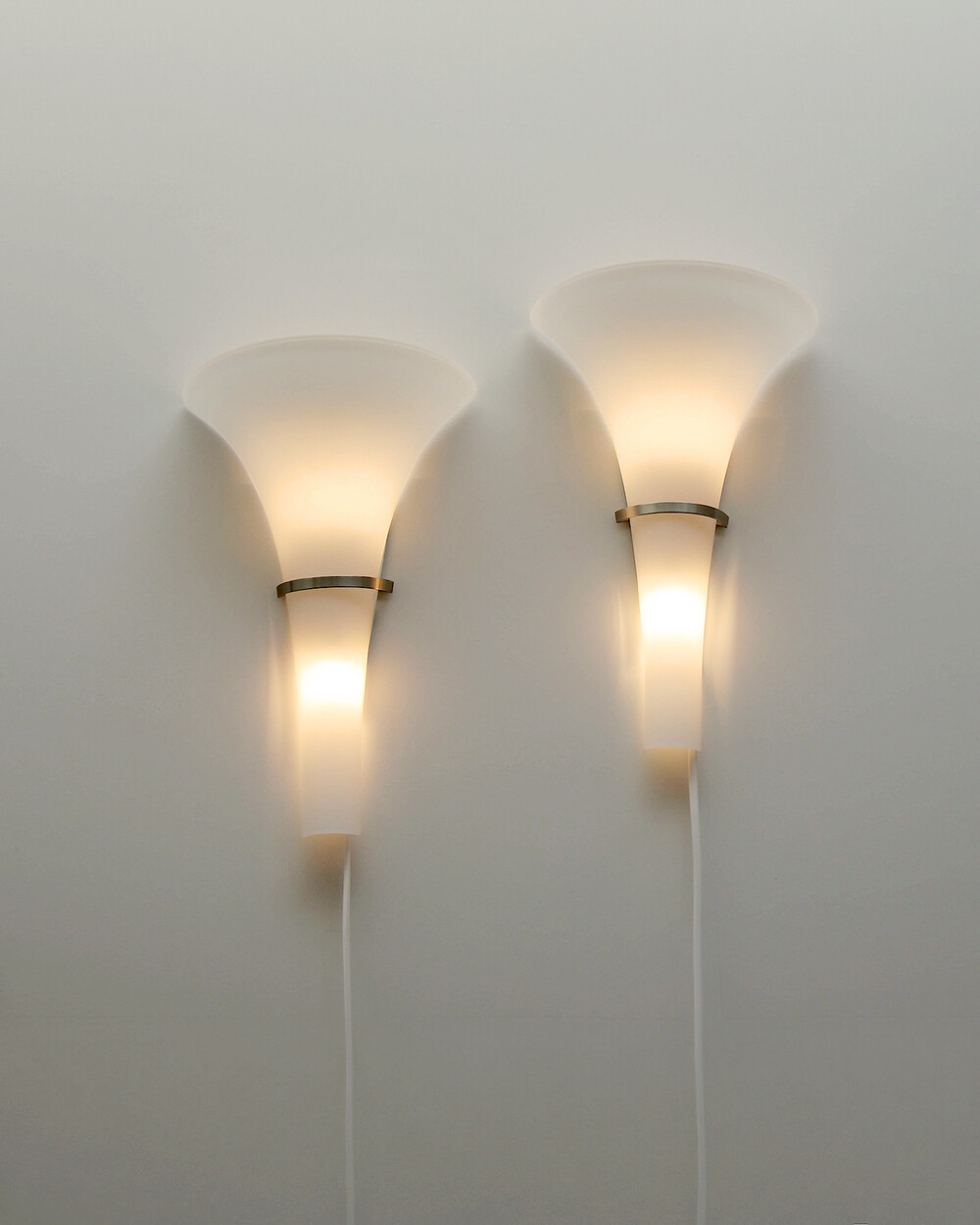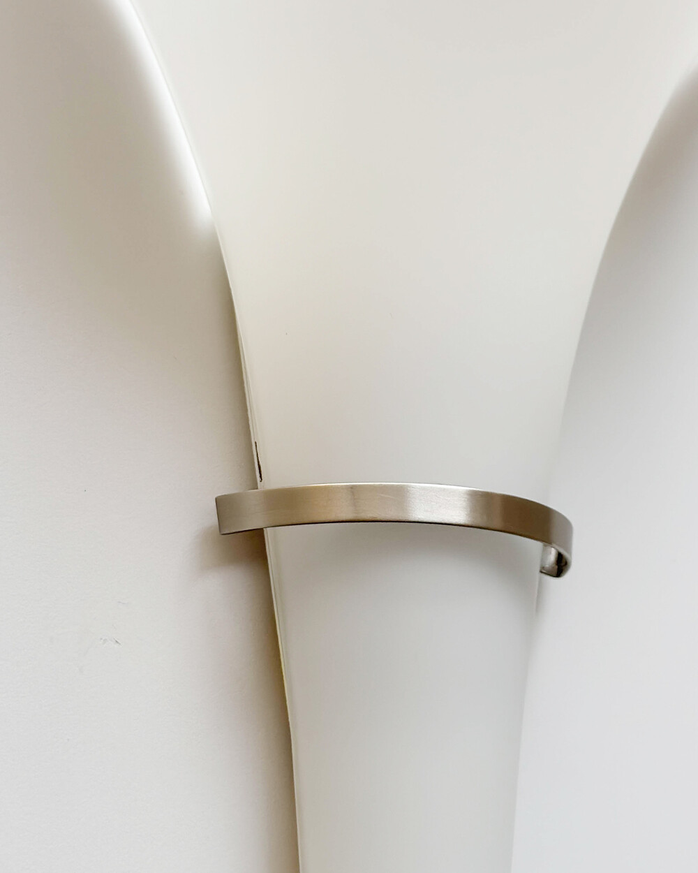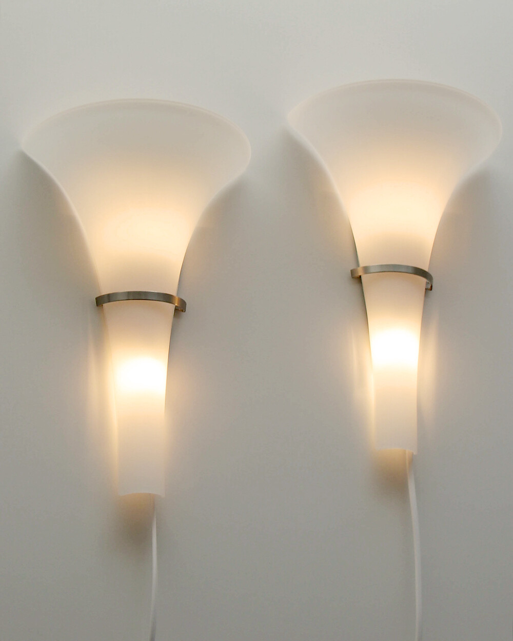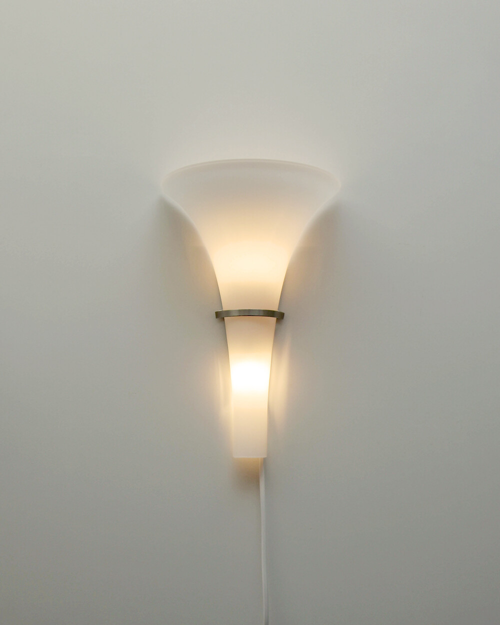 부드럽게 펼쳐지는 긴 나팔 실루엣의 매트하고 차분한 텍스처를 지닌 유백색 글라스로 이루어진 1980년대 독일 월램프입니다.