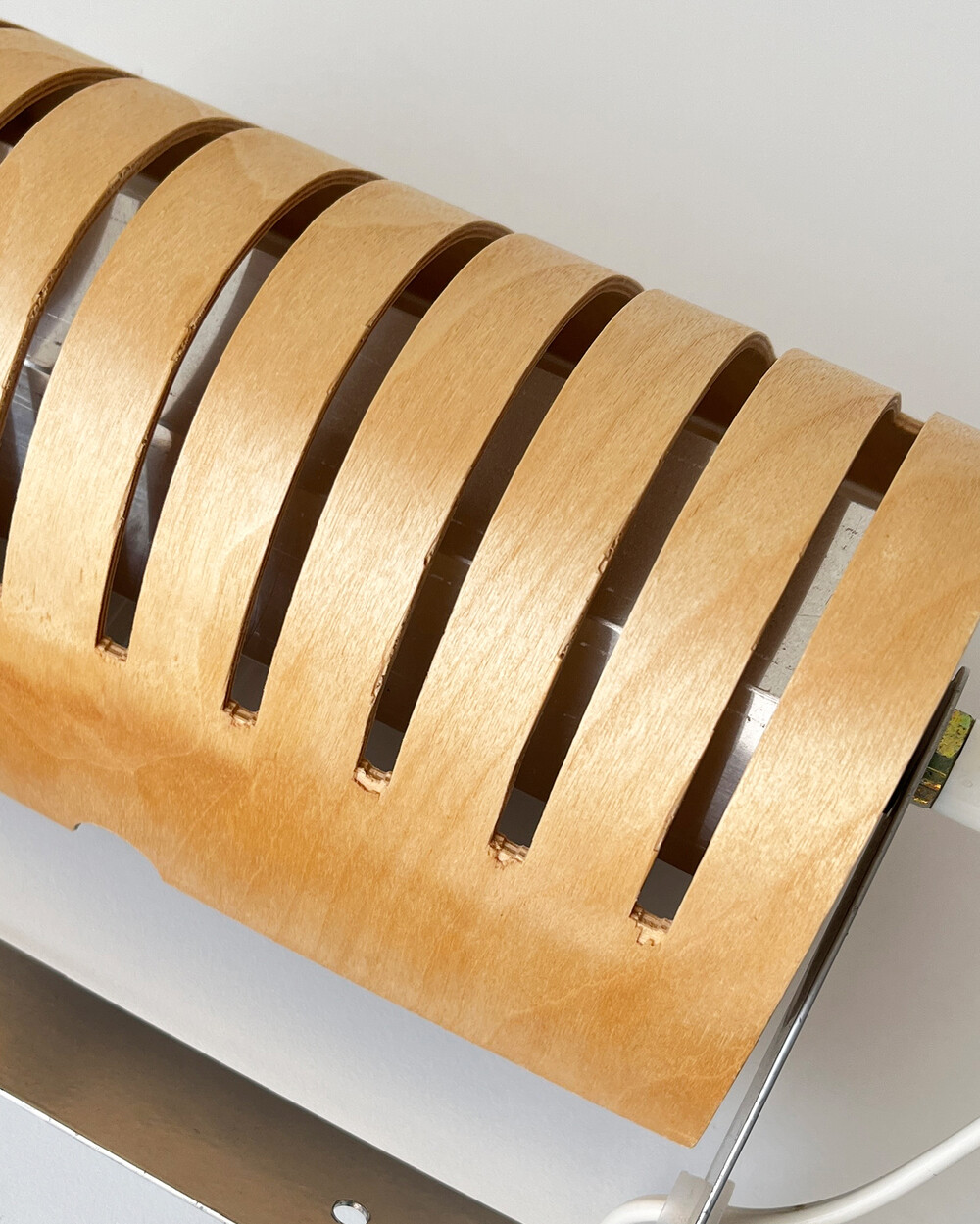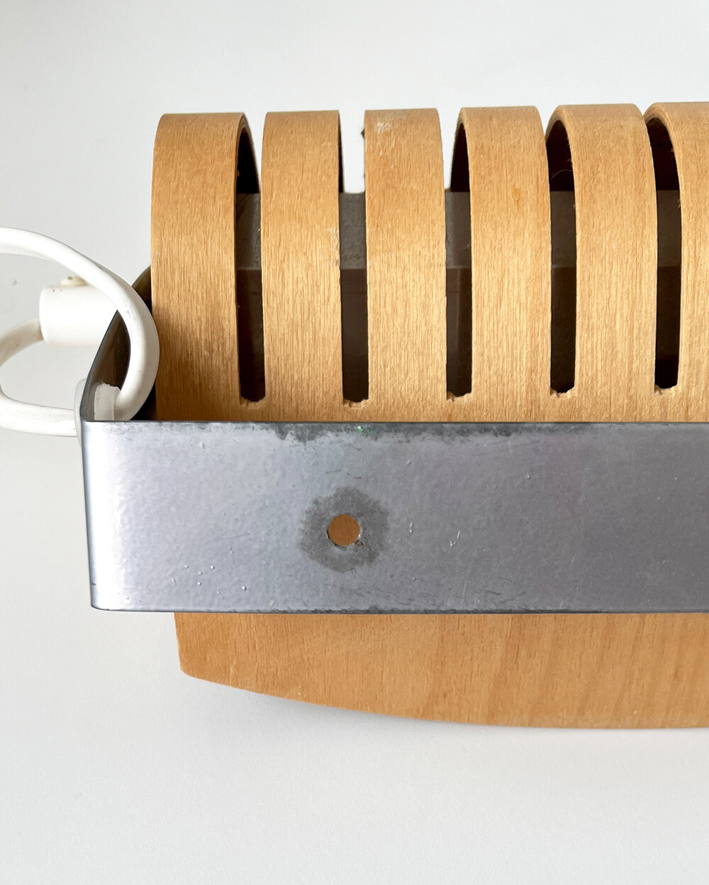 자작나무와 메탈이 조화를 이루는 1980년대 이케아 스웨덴 제작 월램프입니다. 상단과 하단에 슬롯 형태의 오픈 디테일이 더해져 점등 시 은은한 빛의 패턴이 벽면으로 확산되며, 자연스러운 우드 텍스처가 공간에 따뜻한 분위기를 더합니다. 스칸디나비안 미니멀리즘을 담은 80년대 이케아의 디자인 감각이 잘 드러나는 조명입니다.
